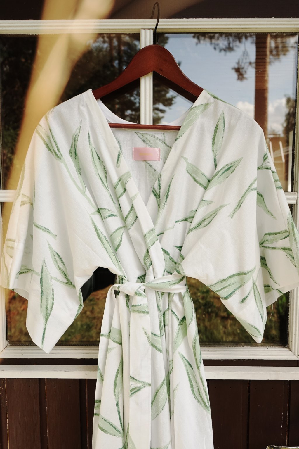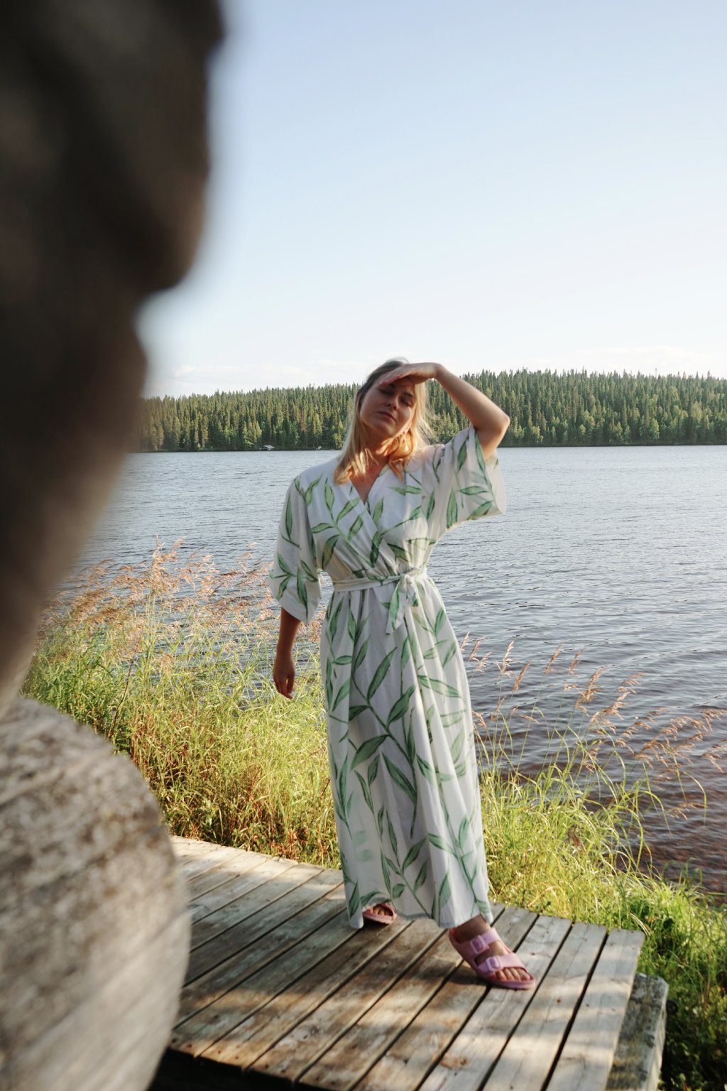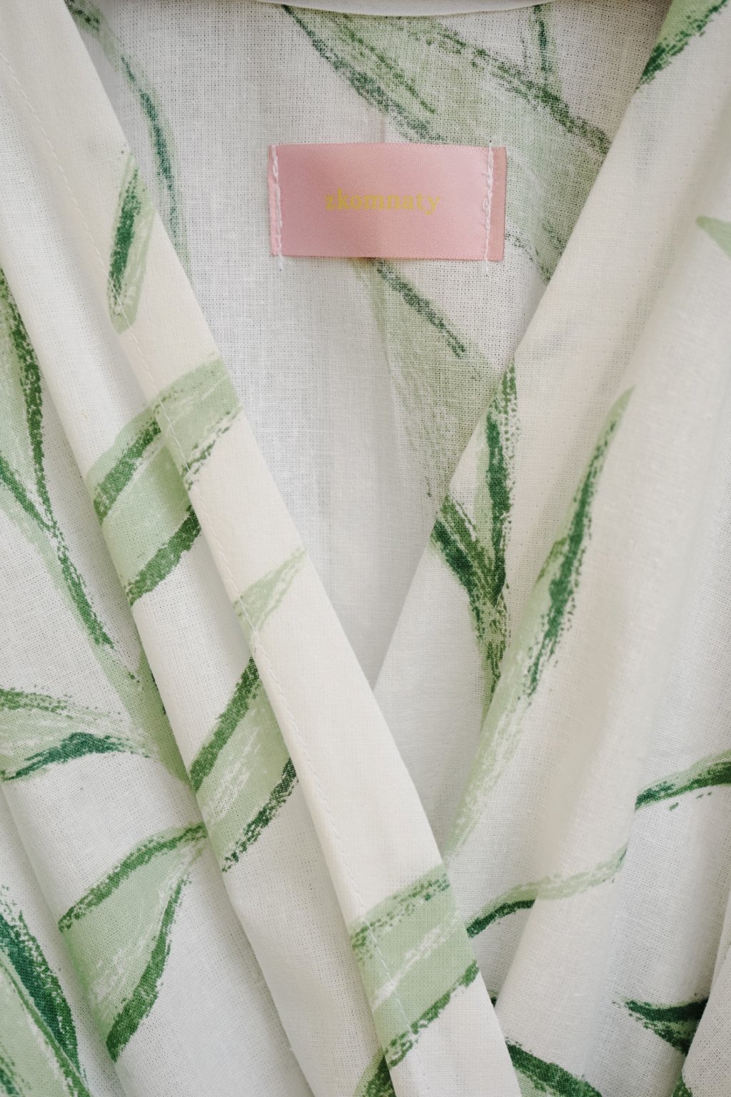 Elegantní Touch of grass jsou šaty, které vás zahalí do té nejpříjemnější bílé bavlny s tiskem zelených lístků. Japonskem inspirovaný střih s páskem a kříženým výstřihem, který sluší moc a každýmu. :) Full lenght potěší, prodlouží a nenechá vás spálit. Kapsy samozřejmostí!
