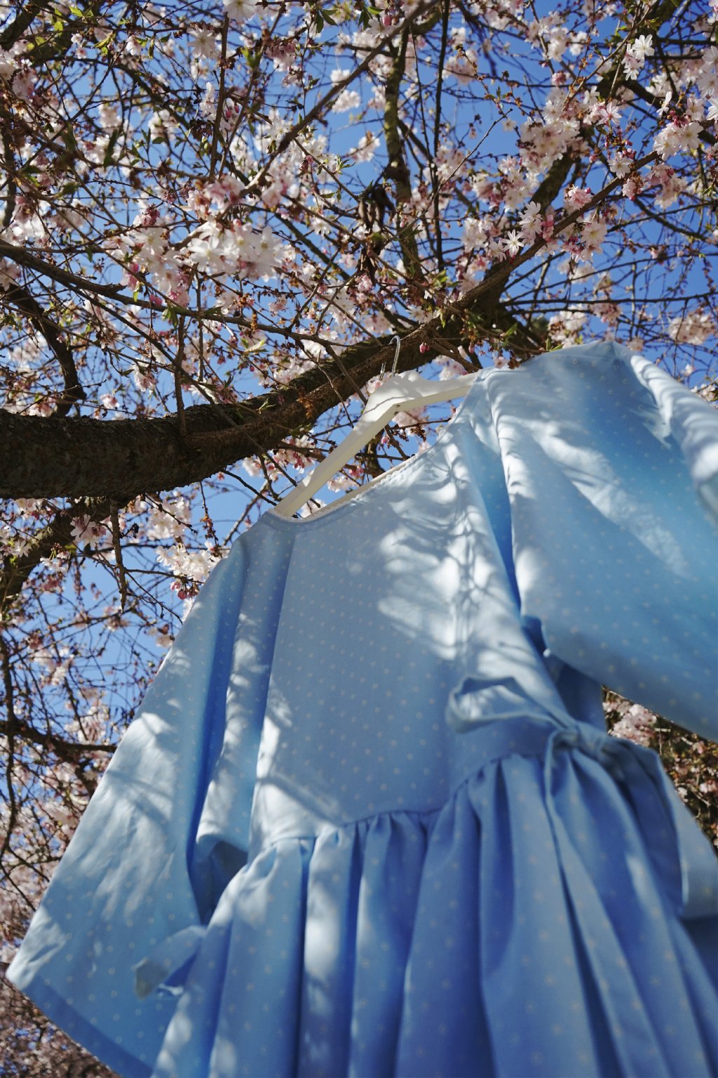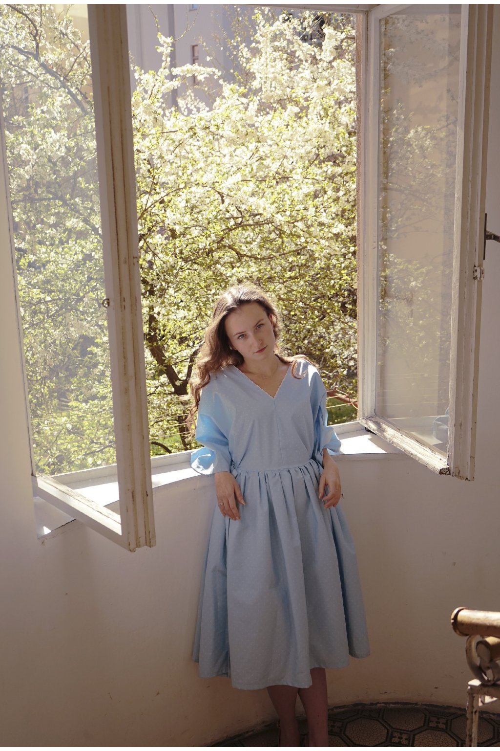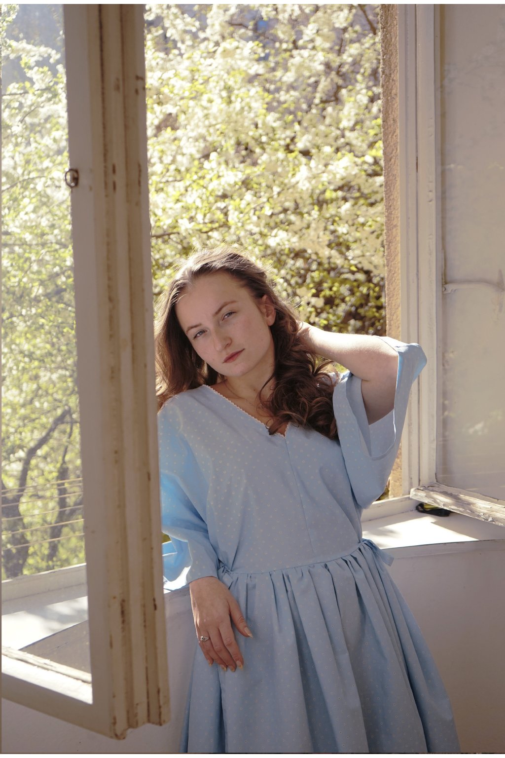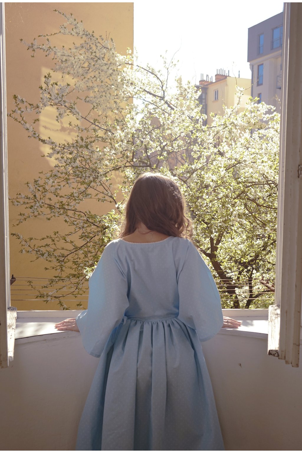 Šaty, inspirované mým nejoblíbenějším obrazem Vincenta Van Gogha. Střih kopíruje šaty Soda Zitrone, které už v nabídce nenajdete a tak je toto jejich něžná, baby blue ségra. Bílé květy na modrém podkladu čisté bavlny, zdobná bavlněná krajka a mašle. Dokonalá jarní romanťárna!