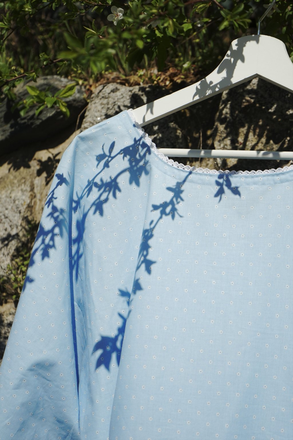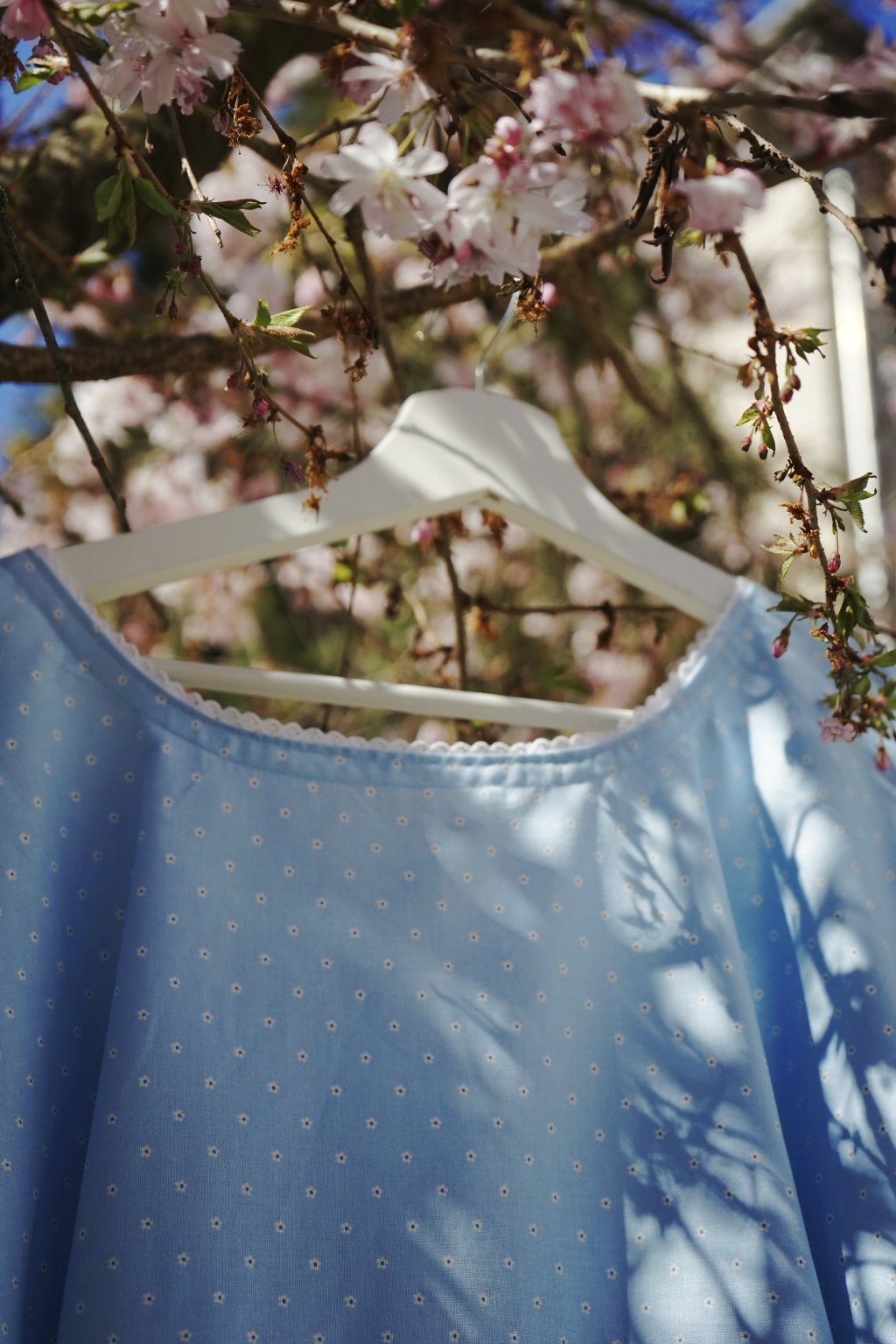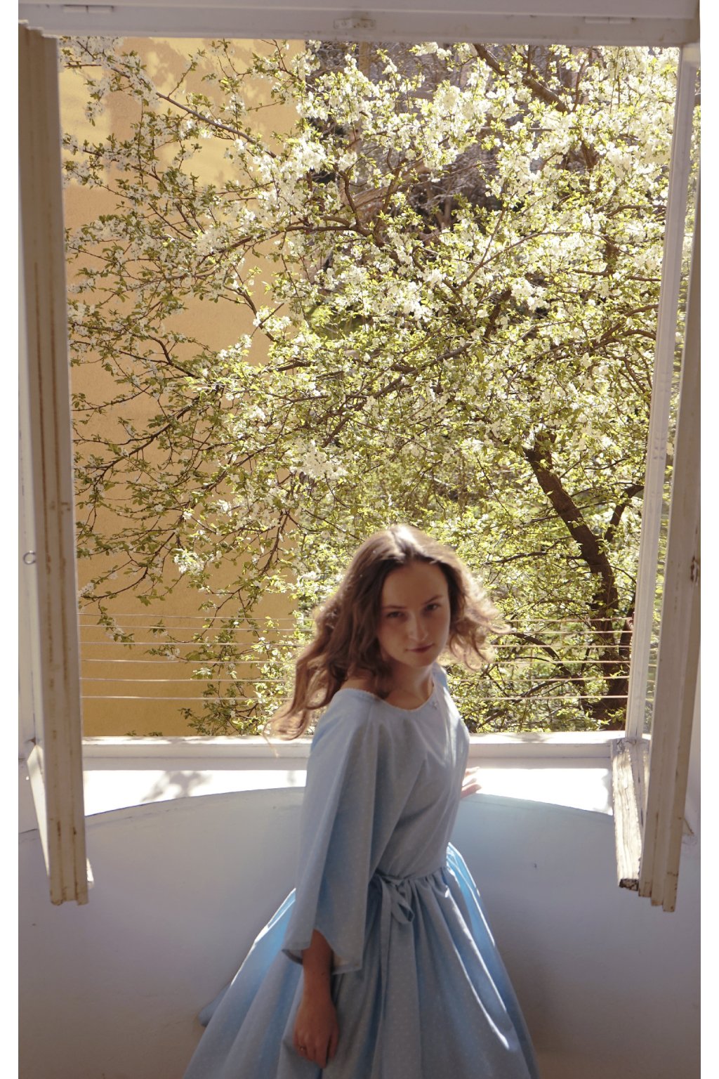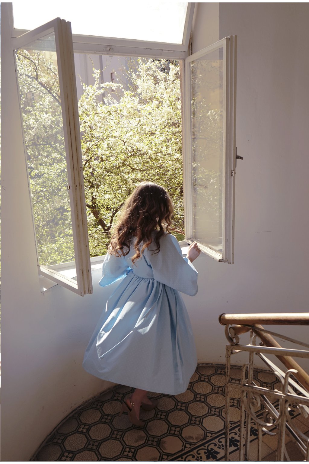 Šaty, inspirované mým nejoblíbenějším obrazem Vincenta Van Gogha. Střih kopíruje šaty Soda Zitrone, které už v nabídce nenajdete a tak je toto jejich něžná, baby blue ségra. Bílé květy na modrém podkladu čisté bavlny, zdobná bavlněná krajka a mašle. Dokonalá jarní romanťárna!