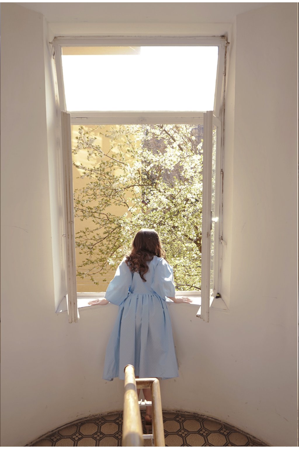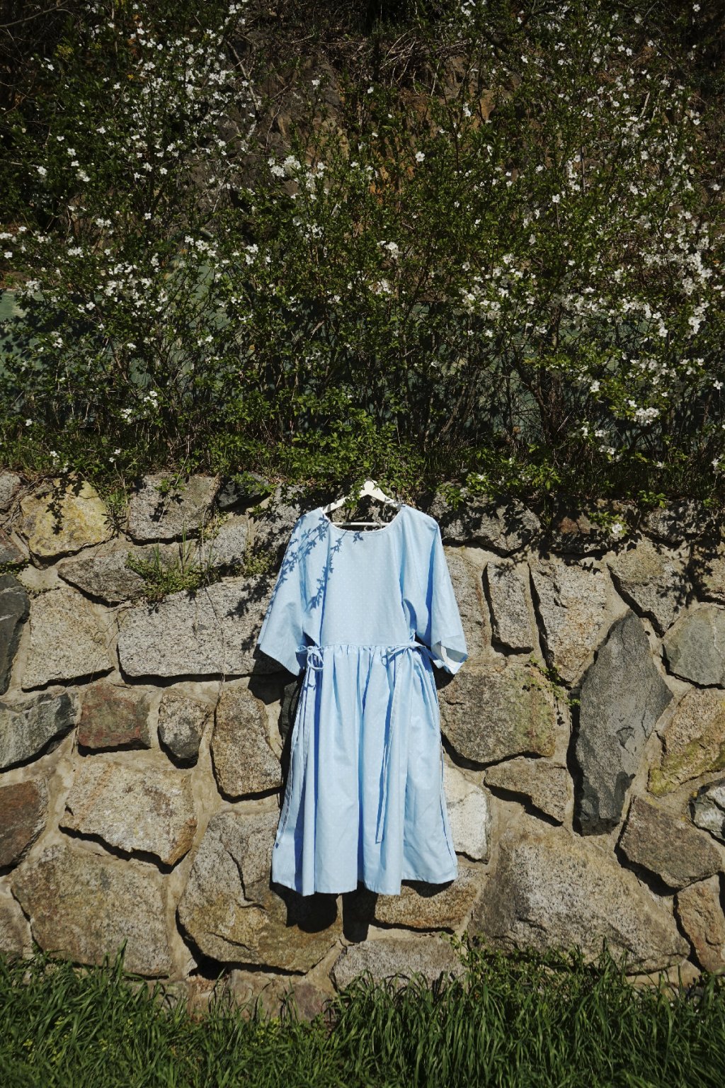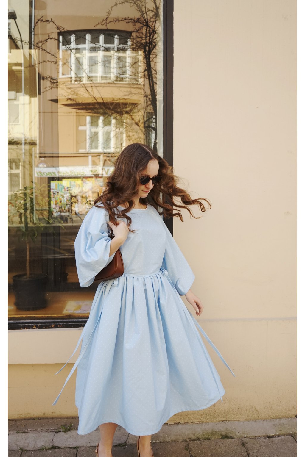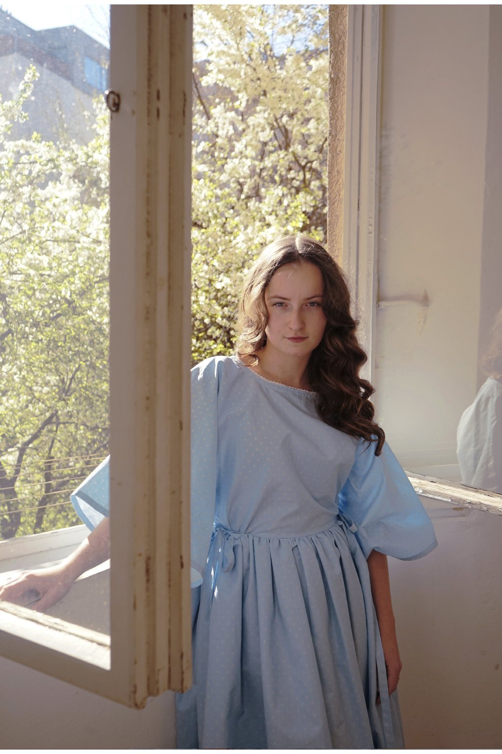 Šaty, inspirované mým nejoblíbenějším obrazem Vincenta Van Gogha. Střih kopíruje šaty Soda Zitrone, které už v nabídce nenajdete a tak je toto jejich něžná, baby blue ségra. Bílé květy na modrém podkladu čisté bavlny, zdobná bavlněná krajka a mašle. Dokonalá jarní romanťárna!