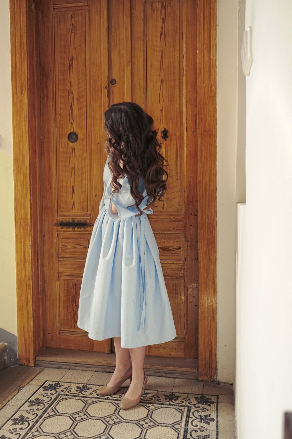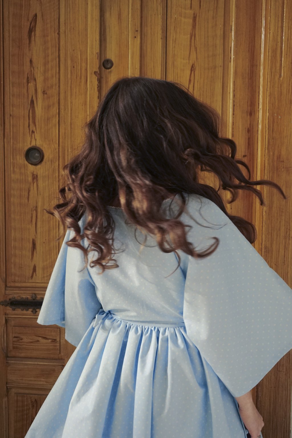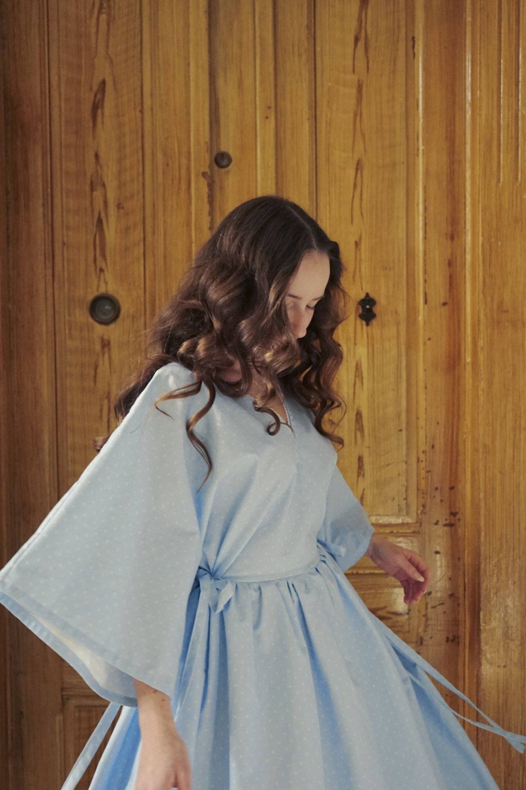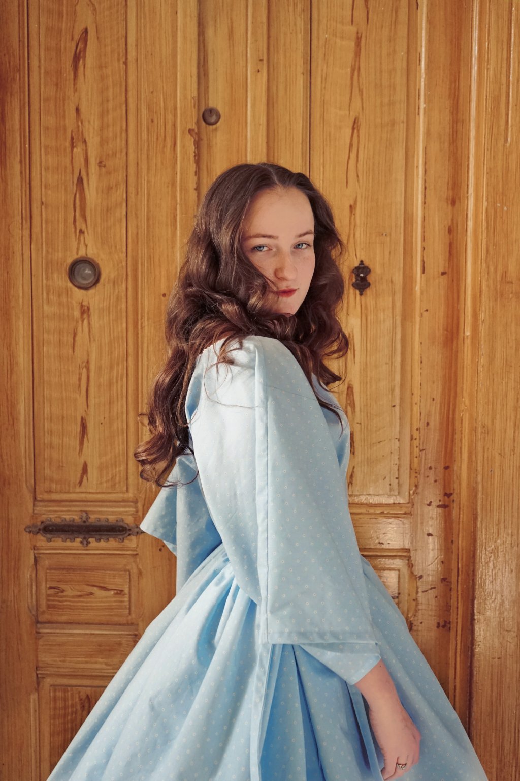 Šaty, inspirované mým nejoblíbenějším obrazem Vincenta Van Gogha. Střih kopíruje šaty Soda Zitrone, které už v nabídce nenajdete a tak je toto jejich něžná, baby blue ségra. Bílé květy na modrém podkladu čisté bavlny, zdobná bavlněná krajka a mašle. Dokonalá jarní romanťárna!
