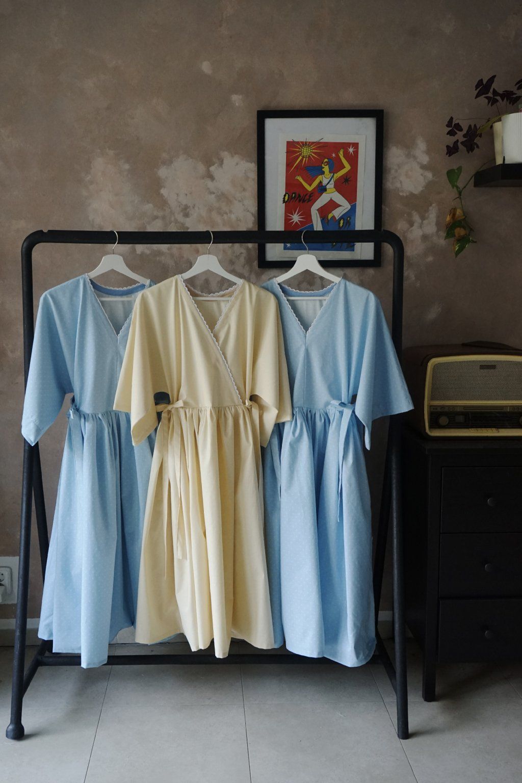 Šaty si tedy obléknete jako volné šaty a dle potřeby je v obou bocích můžete vypasovat na dvě mašle. Nebo mašličky nechte volně, je to na Vás. Stužky samozřejmě můžete i jen obvázat okolo pasu jako klasický pásek. Lze je nosit s kulatým výstřihem, či se skládaným V výstřihem. Podle nálady. Výstřih je celý lemovaný bílou, bavlněnou krajkou, která jen lehce vyčuhuje. Kimono rukávy korespondují s 50. léty a šaty mají v sukni samozřejmě skryté kapsy.