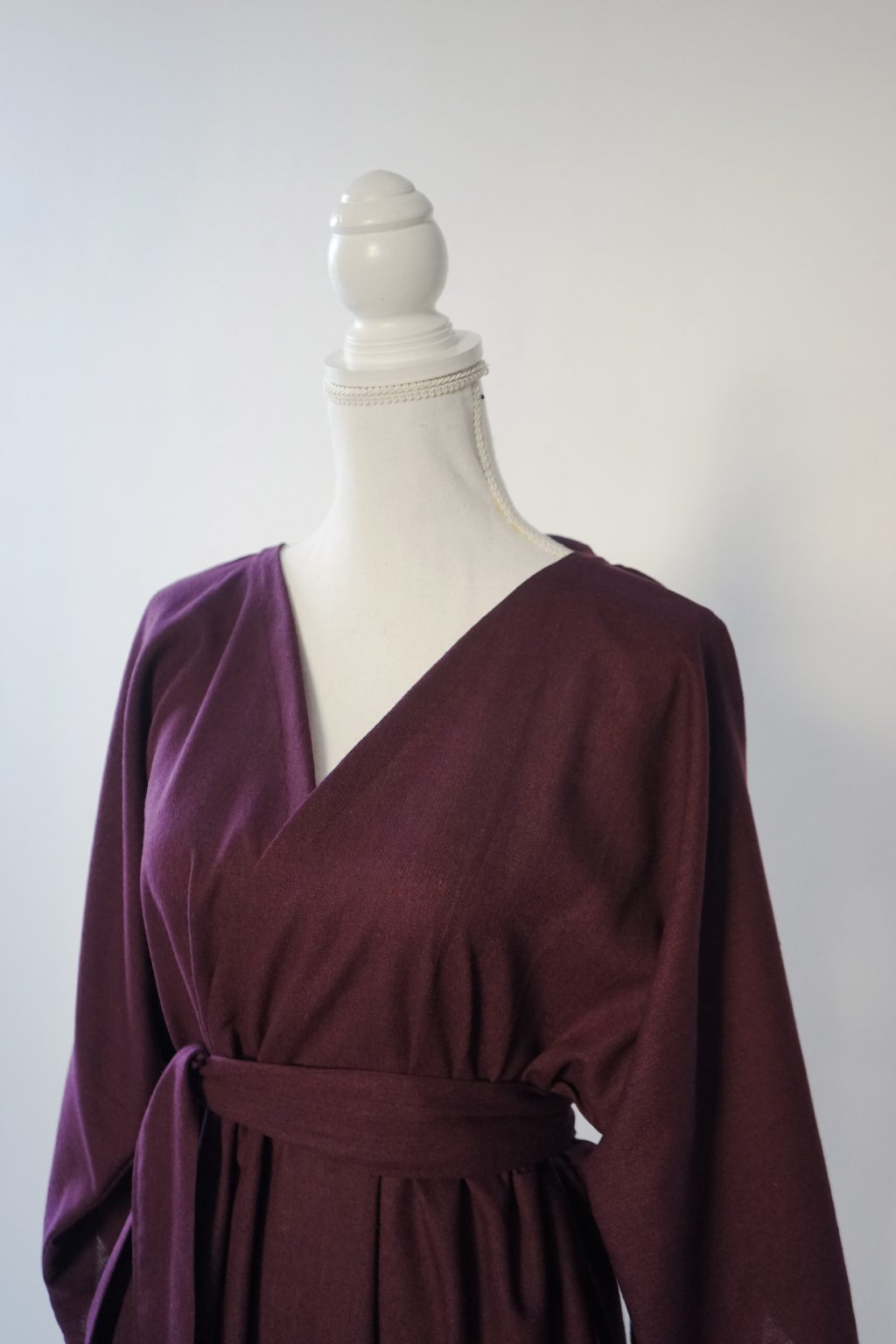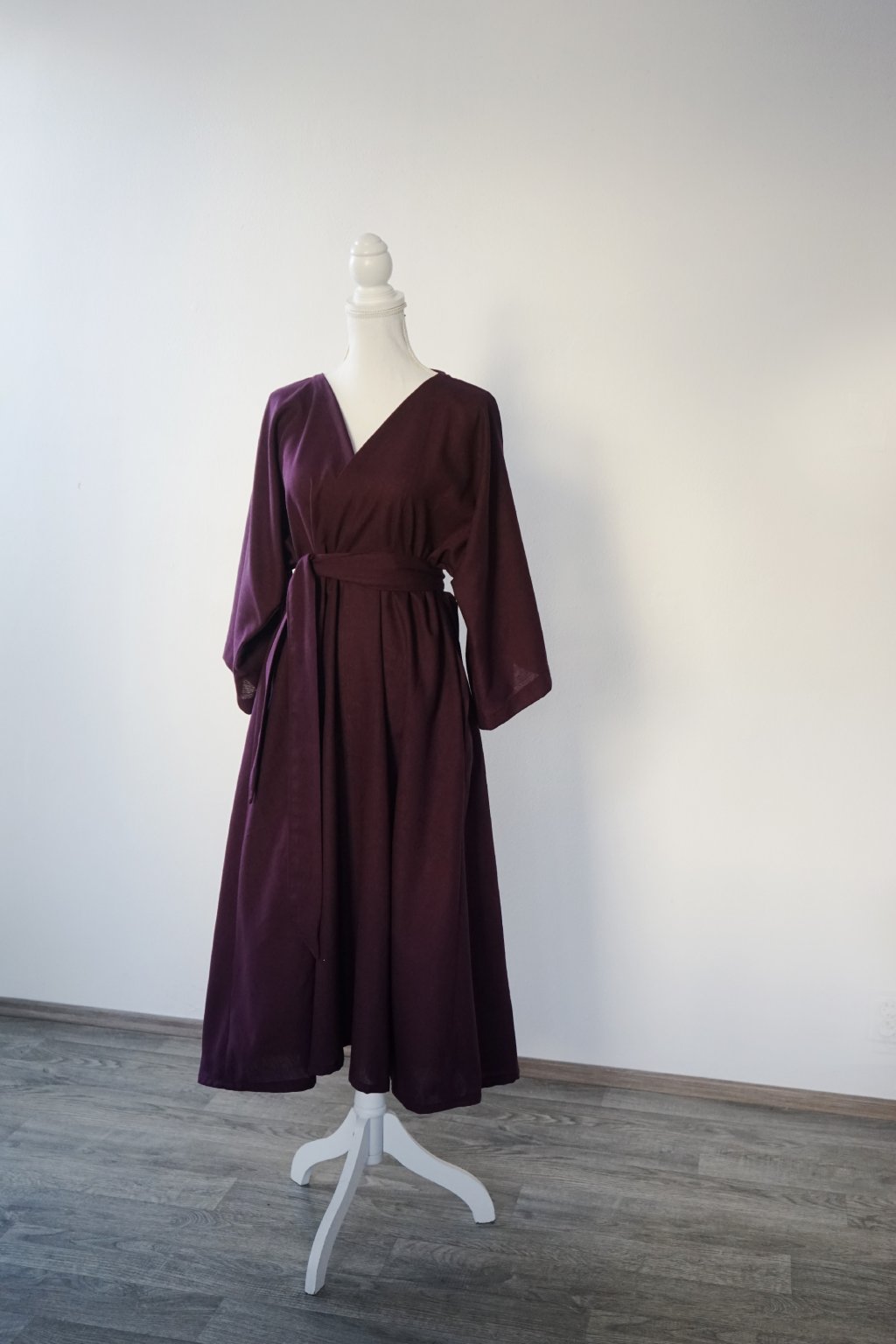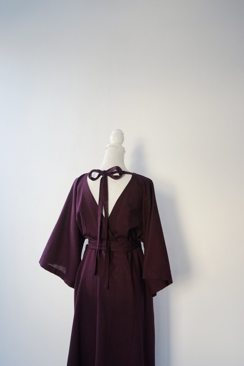 Střih je typický samozřejmě svými kimono rukávy a kříženým výstřihem, který najdete z obou stran! Aby Vám šaty náhodou nespadly z ramen, výstřih si pojistíte elegantním vázáním na mašli za krkem. Zároveň tak můžete i přizpůsobit šíři výstřihu.