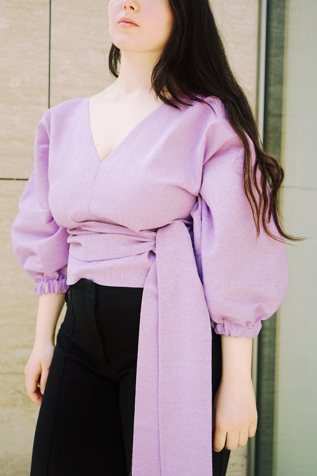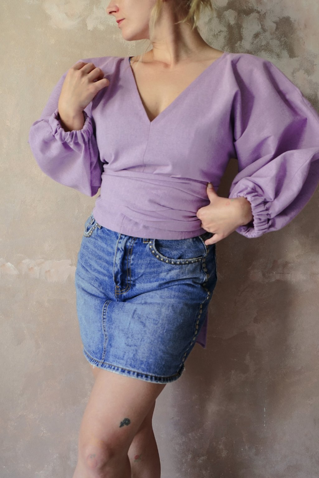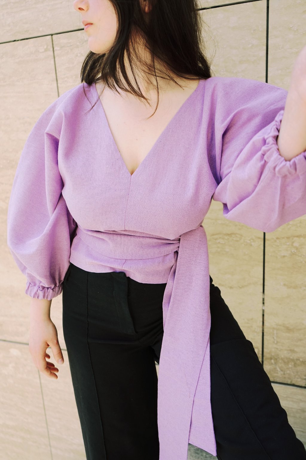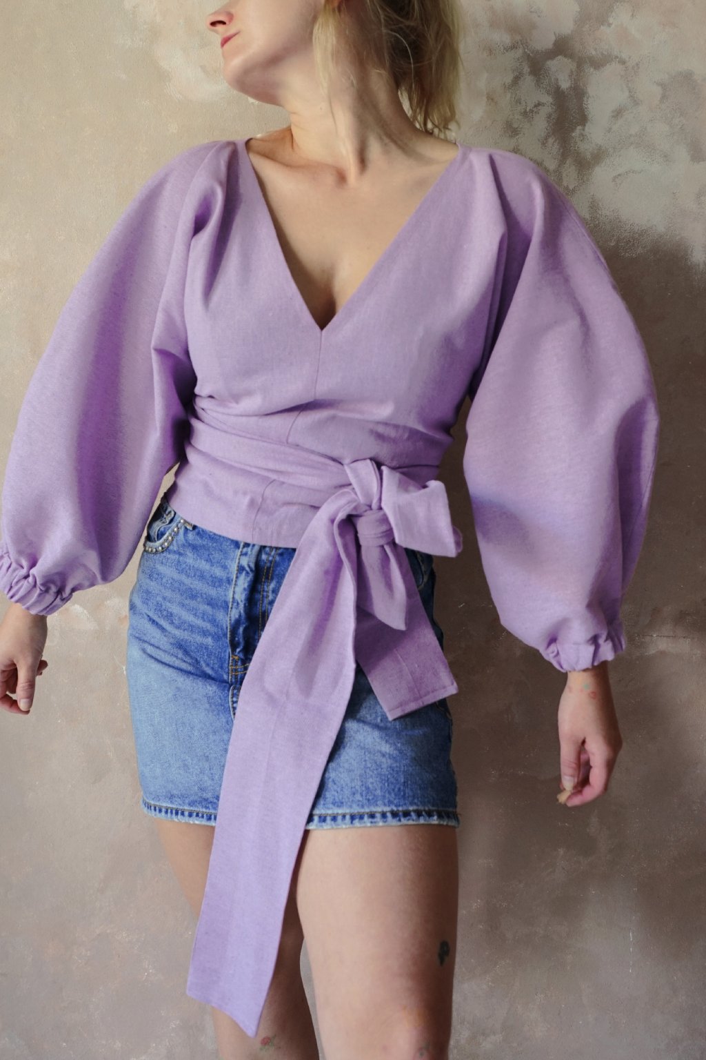 Nepřehlédnutelné rukávy a vosí pas, to je náš nový zavinovací top! Po jeho krémové variantě ho pro Vás limitovaně šiji i z mé nejmilejší lila bavlny!