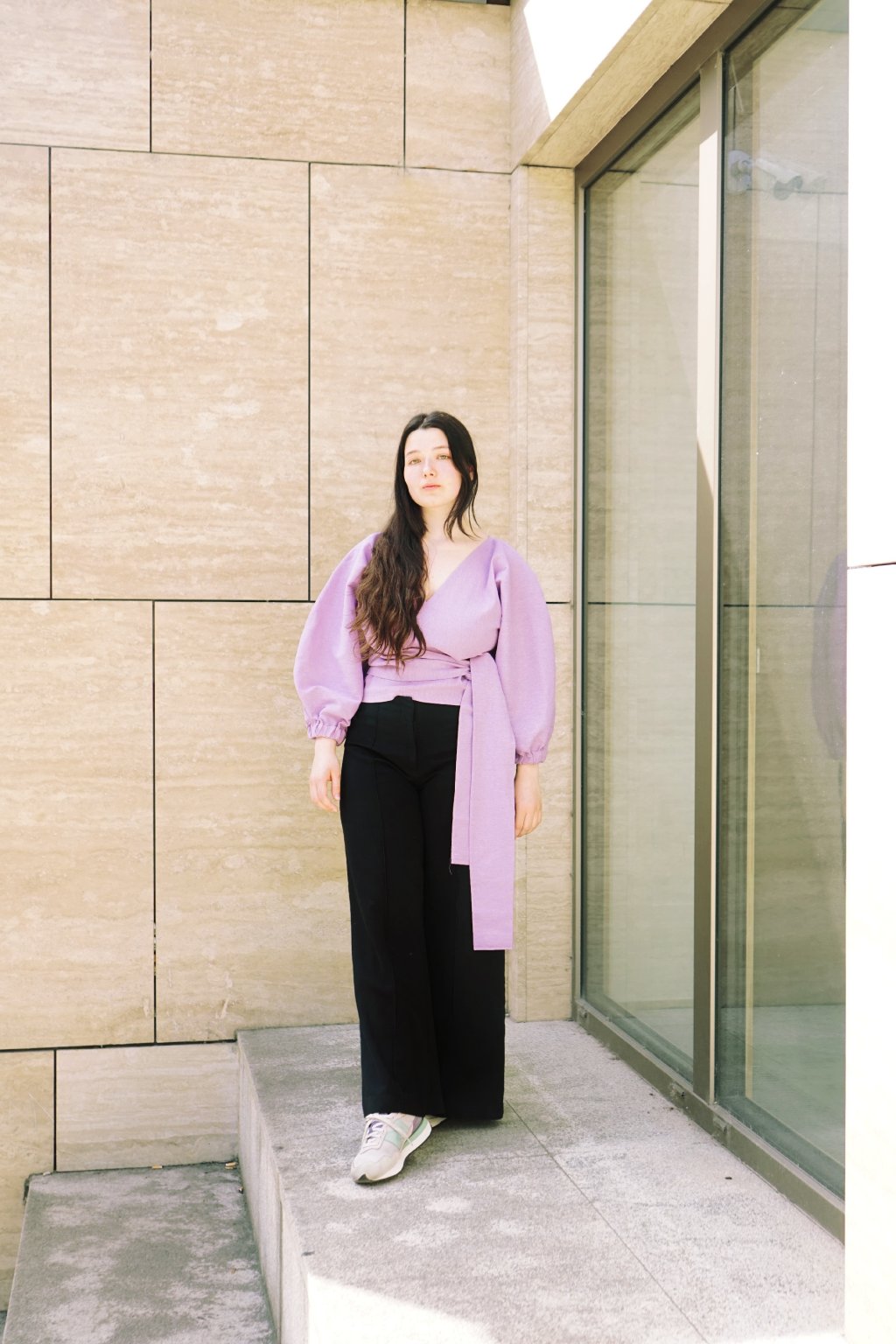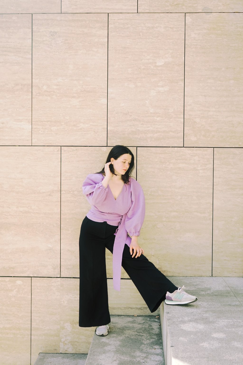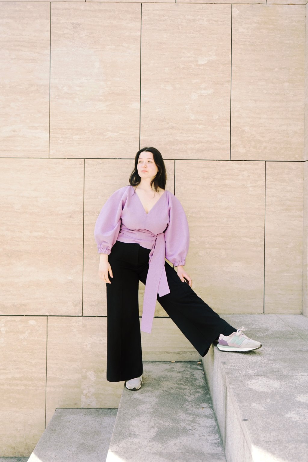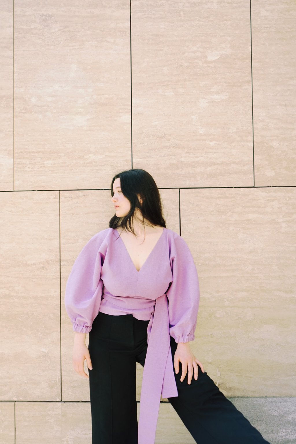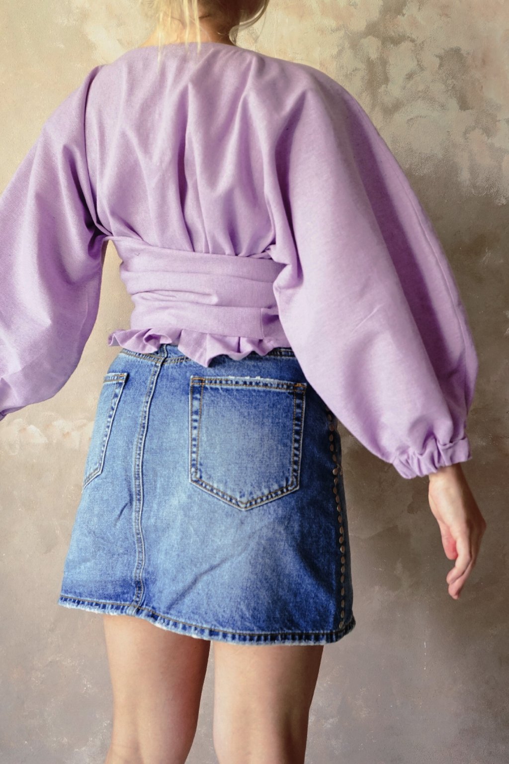 Nepřehlédnutelné rukávy a vosí pas, to je náš nový zavinovací top! Po jeho krémové variantě ho pro Vás limitovaně šiji i z mé nejmilejší lila bavlny!