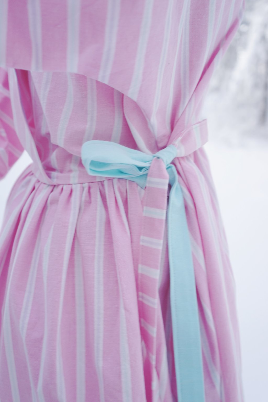 Když vidím v sekáči růžovou, vždycky zpozorním. Tyto šaty jsou ušité nakonec ze dvou různých sekáčových povlečení – růžové s proužky a pak tyrkysové. Tím jsem šaty osladila v mašlích, kterými v bocích šaty vypasujete. Šaty mají bohatou řasenou sukni, jednu mašli navíc na zádech a skryté kapsy.