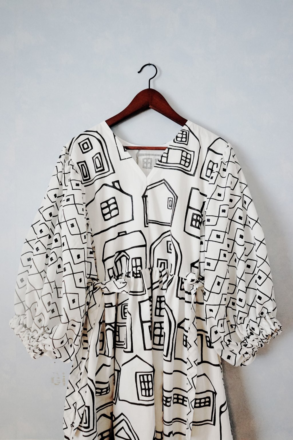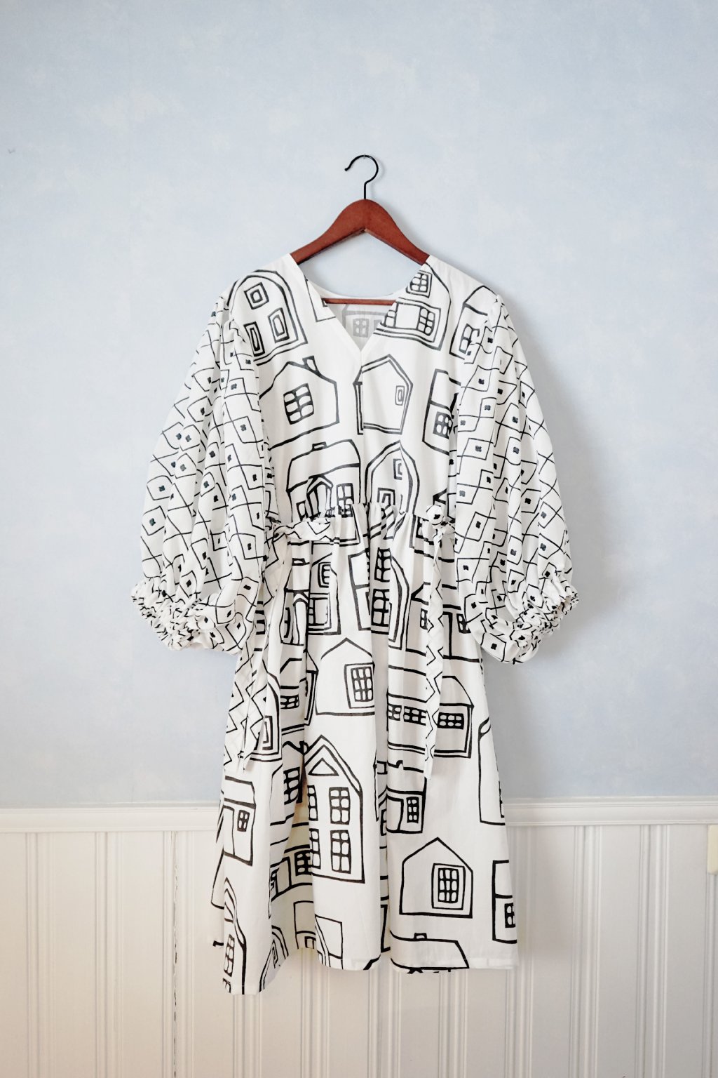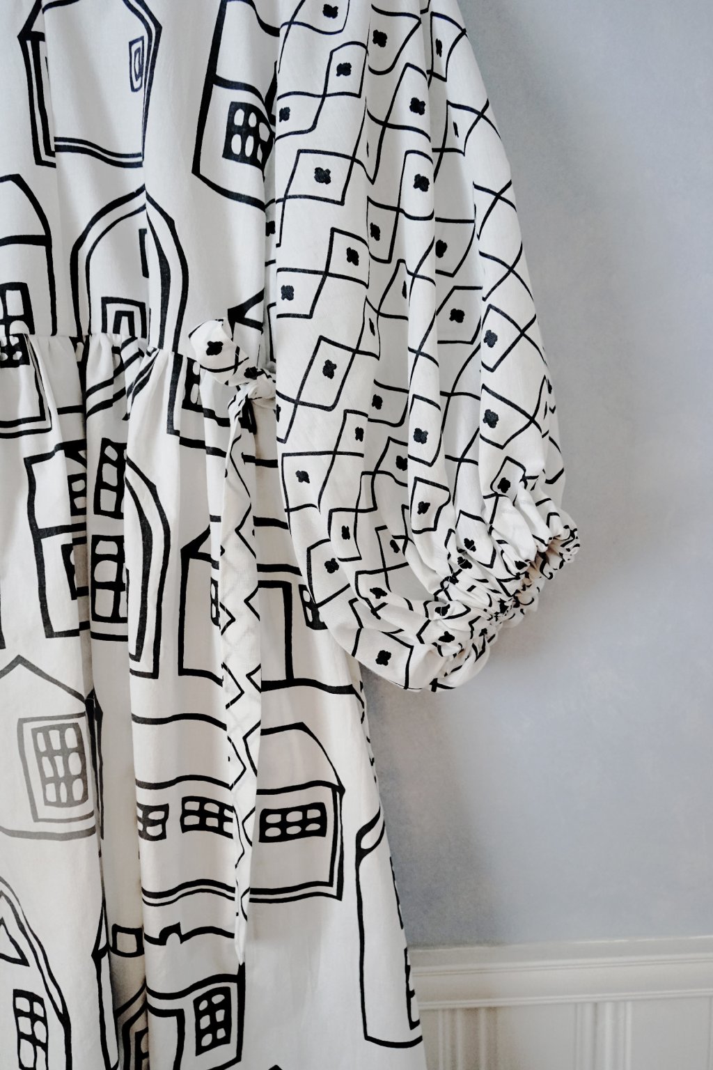 Když jsem našla tu nádhernou látku s domečky, věděla jsem, že mi na šaty dle mých představ stačit nebude. A tak jsem začal hledat látku, kterou bych domečky doplnila - a našla jsem! Vznikly tak černobílé šaty s bohatými řasenými rukávy, mašlemi v bocích a skrytými kapsami. Celé ušité ze dvou různých secondhandových látek, které by se jinak asi nikdy nepotkaly. A jak jim to sluší!
