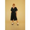 Střih overalu vychází z našich Oněch šatů. Ale i ten základ jsme trochu vylepšili – zdokonalili jsme výstřih a přidali skryté kapsy v bocích. Overal navíc nemá jasně danou výšku pasu švem (protože každý máme pas trochu jinde žejo). Jak je u nás už zvykem, vypasujete si ho dle potřeby páskem, který je součástí overalu. Nohavice overalu svoji třičtvrteční délkou i šířkou připomínají culottes. Oblékání overalu je raz dva. Záda mají dostatečně hluboký rozparek, který na krku jednoduše zapínáte na jeden knoflík.