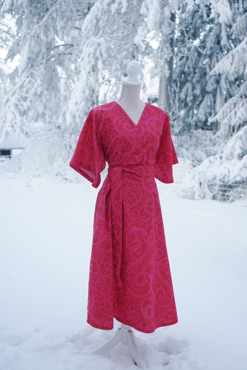 Vznikly mi kimono šaty s všitým páskem, který najdete v bocích a obtočíte jej kolem pasu dle potřeby. Tím šaty i nádherně vypasujete! Sukně je jednoduchá, áčková se skrytými kapsami. Vrchní díl jsem v prsou lehounce nařasila pro objem.
