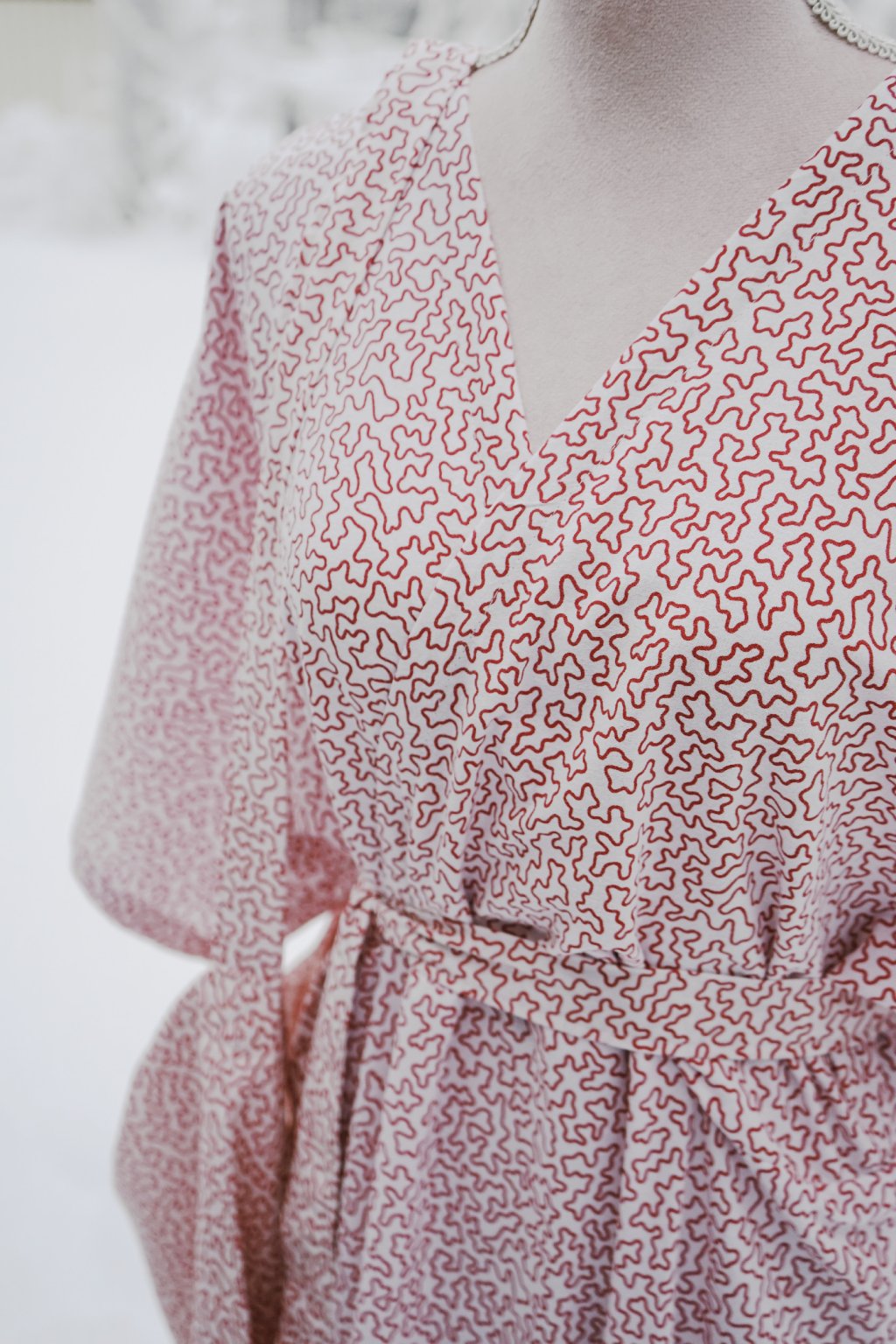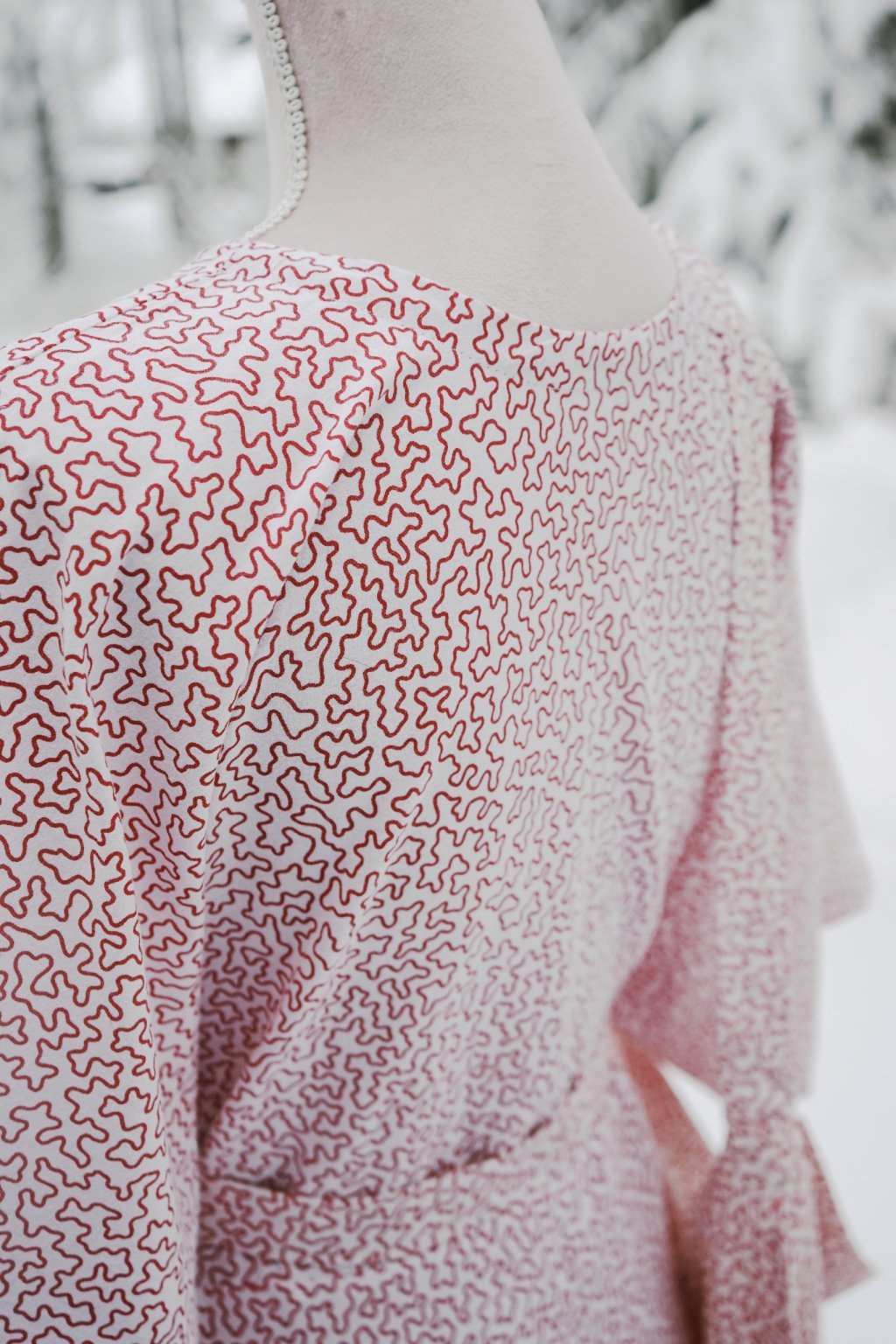 Neskutečně příjemná, jemná bavlna s drobným, červeným vzorkem, byla původně povlečením. Z peřin jsem tak ušila tyto dlouhý, romantický šaty s kimono rukávy a skrytými kapsami. A z polštáře? Z toho jsem k nim ušila ladící tašku na Vaše pochůzky do Kaufecu. <3 Nicméně těmto šatům by to slušelo i v divadle, viďte.