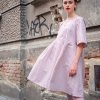 První střih našich kolekcí Z Komnaty. Měli jsme v hlavě šaty. Tak velký, že si jich na ulici všimnete a zároveň střižených tak, aby si zachovaly ženskost. Bez pásku evokují siluetu mid-60s a s páskem variaci na padesátkovej New Look. Šaty, ve kterých si kecnete do trávy na pikniku, ale vyvedete je i na večírek.