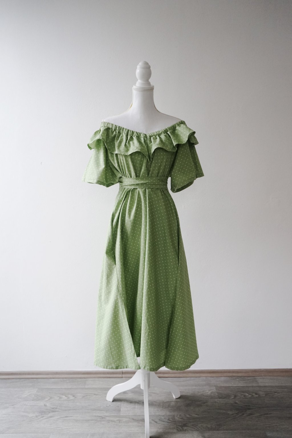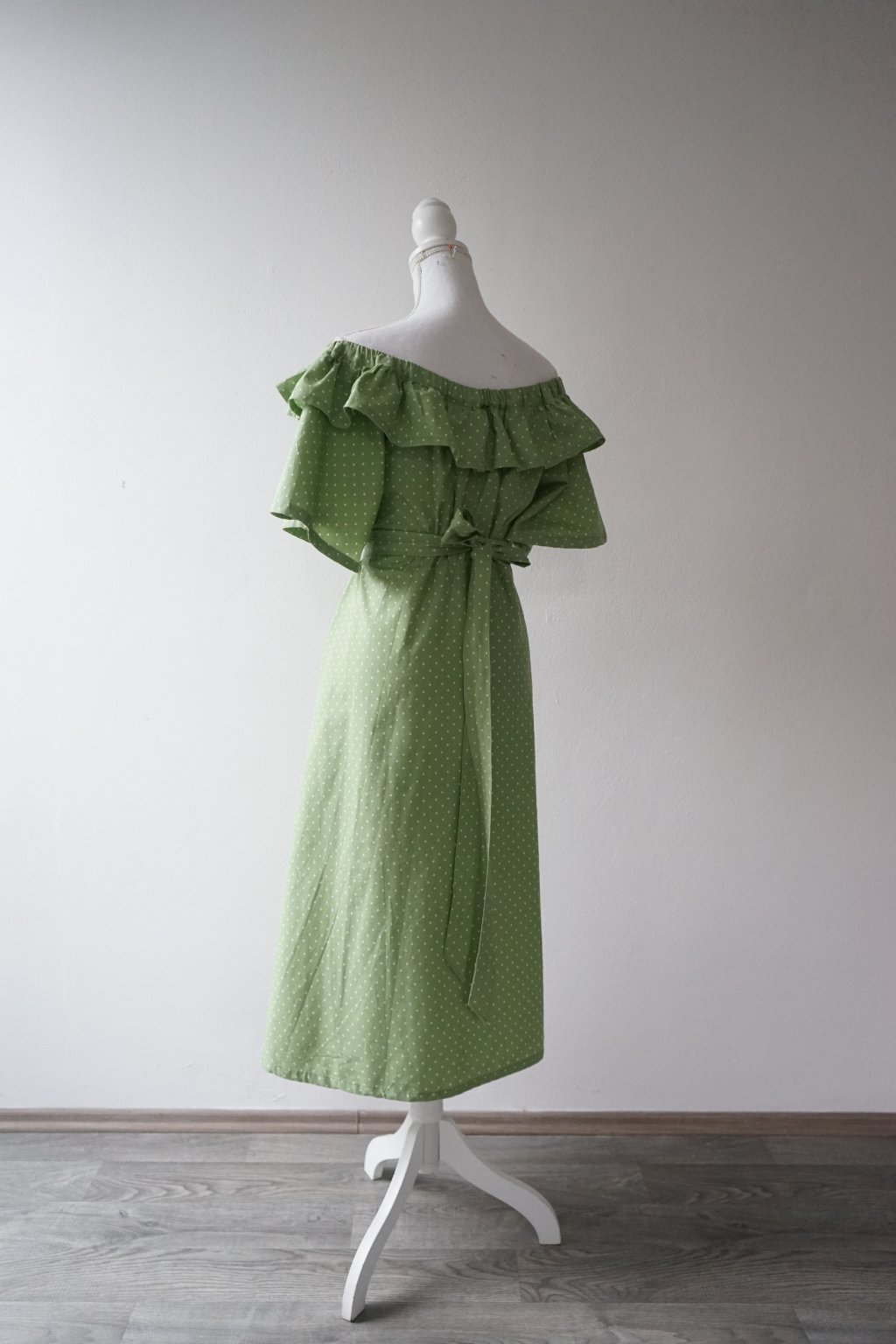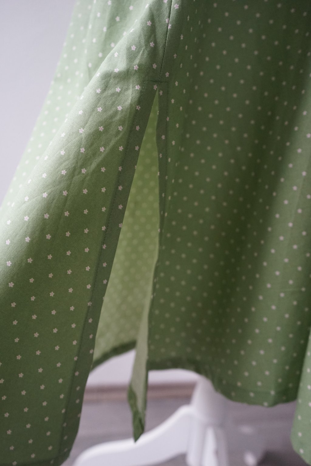 Šaty La Dolce Vita v barvě spinaci ušité z nádherné zelené bavlny s drobnými kvítky. Tento střih se liší finálním střihem jen v tom, že má více "srdcovitý" výstřih (dnes jej šiju rovně) a mají krátké rozparky v sukni. Ty jsem ve finále vynechala.