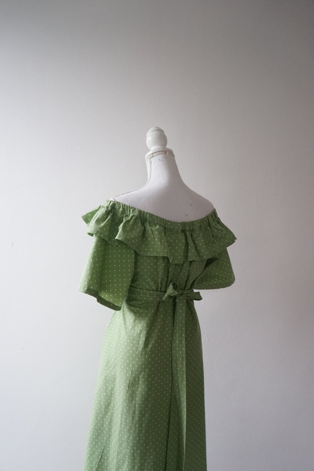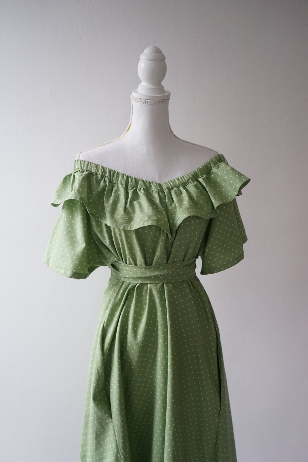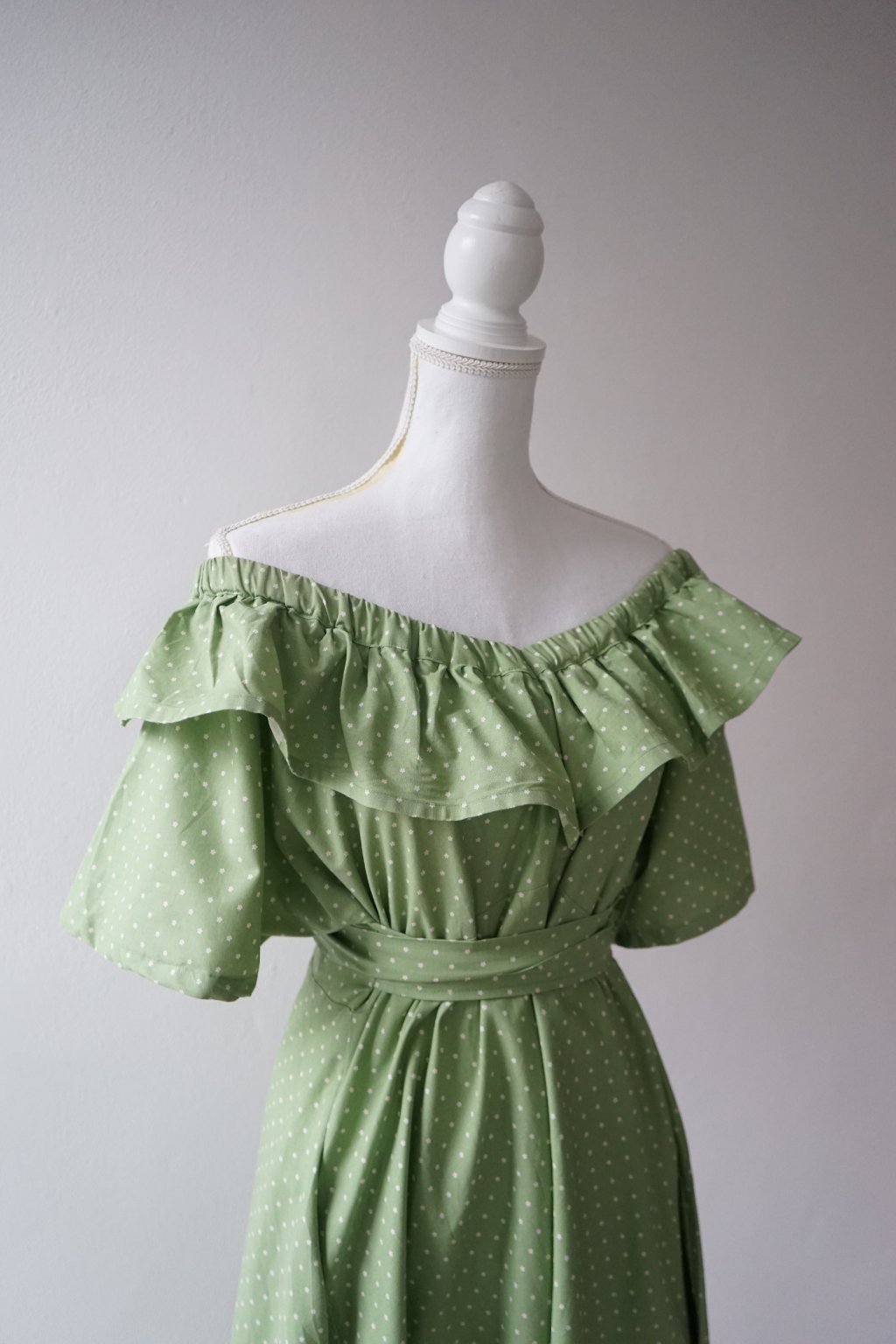 Šaty La Dolce Vita v barvě spinaci ušité z nádherné zelené bavlny s drobnými kvítky. Tento střih se liší finálním střihem jen v tom, že má více "srdcovitý" výstřih (dnes jej šiju rovně) a mají krátké rozparky v sukni. Ty jsem ve finále vynechala.
