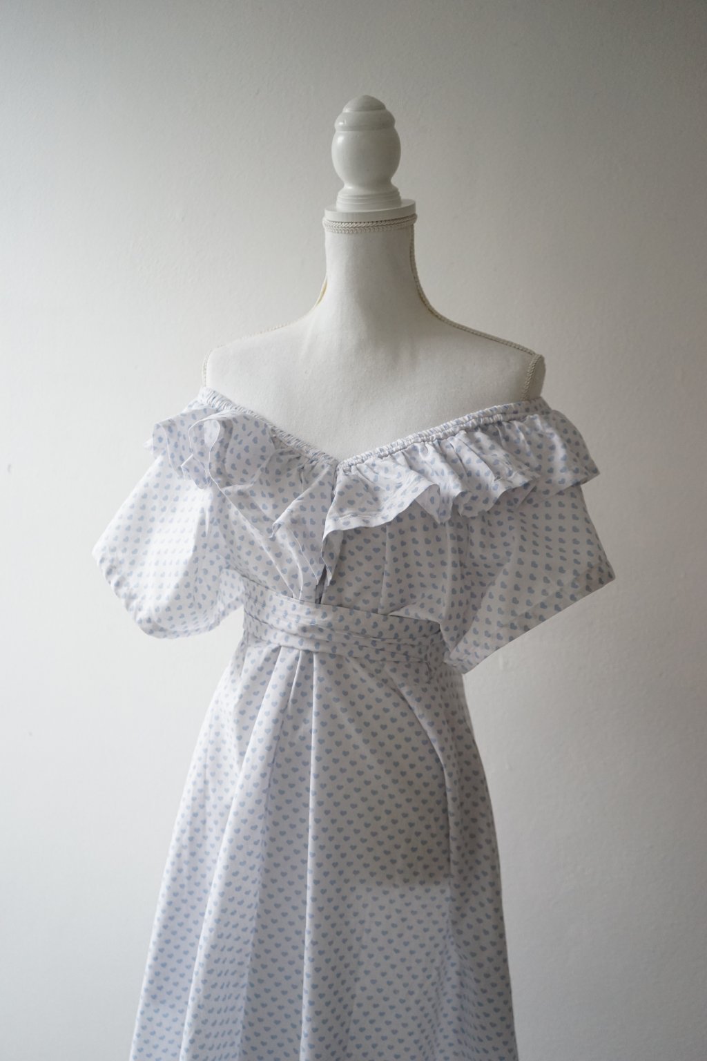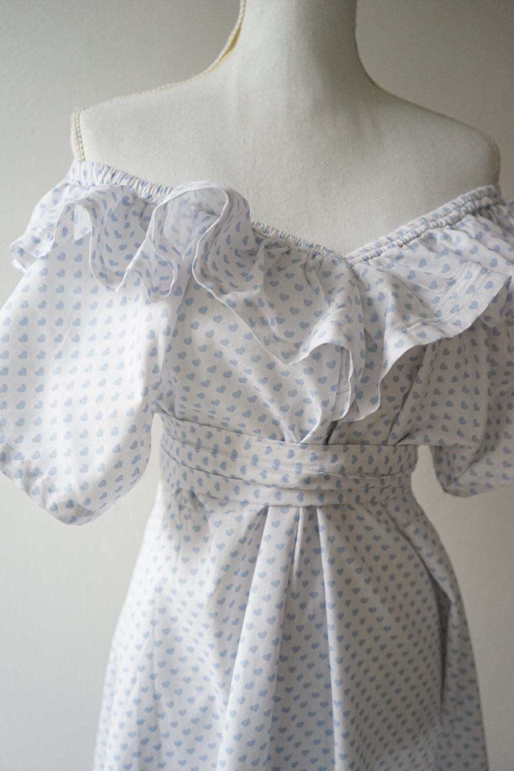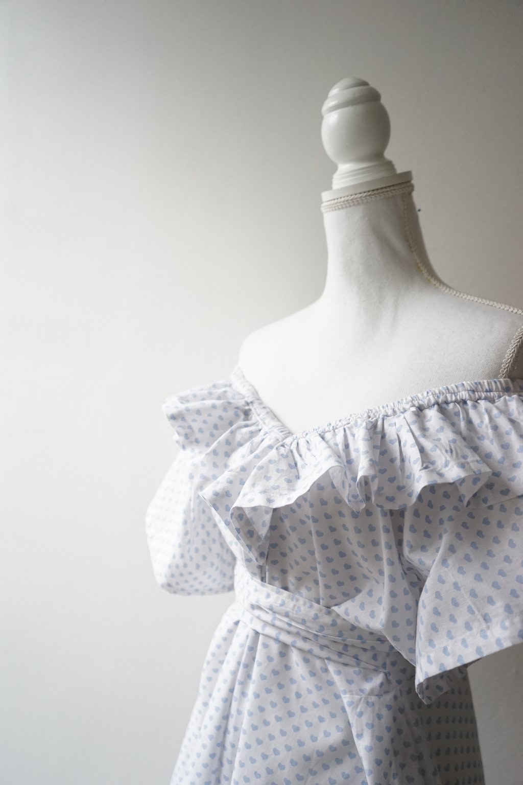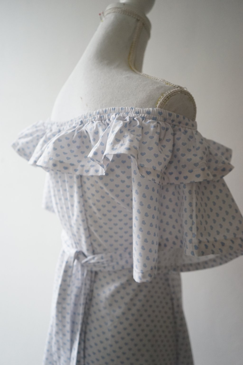 Ušité z bílé bavlny poseté srdíčky. Tyto šaty jsem nakonec v této variantě nikdy nevydala. Střih výsledných La Dolce Vita byl taky trochu pozměněn - tyto srdíčkové šaty mely ještě šev v přední části, kdy má tak výstřih i srdcovitý tvar. Rukávky mohou být spadené, nebo je můžete mít posazené výše - vše pojištěné gumou. Tato guma je u tohoto střihu také tenčí, než jsem ve výsledném střihu zvolila. Mají kapsy a všitý pásek, kterým šaty vypasujete dle potřeby.
