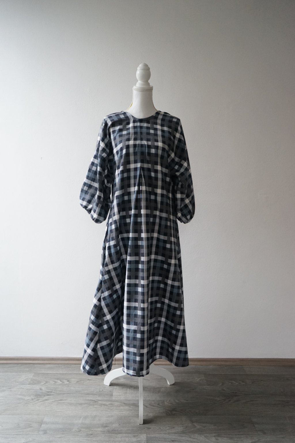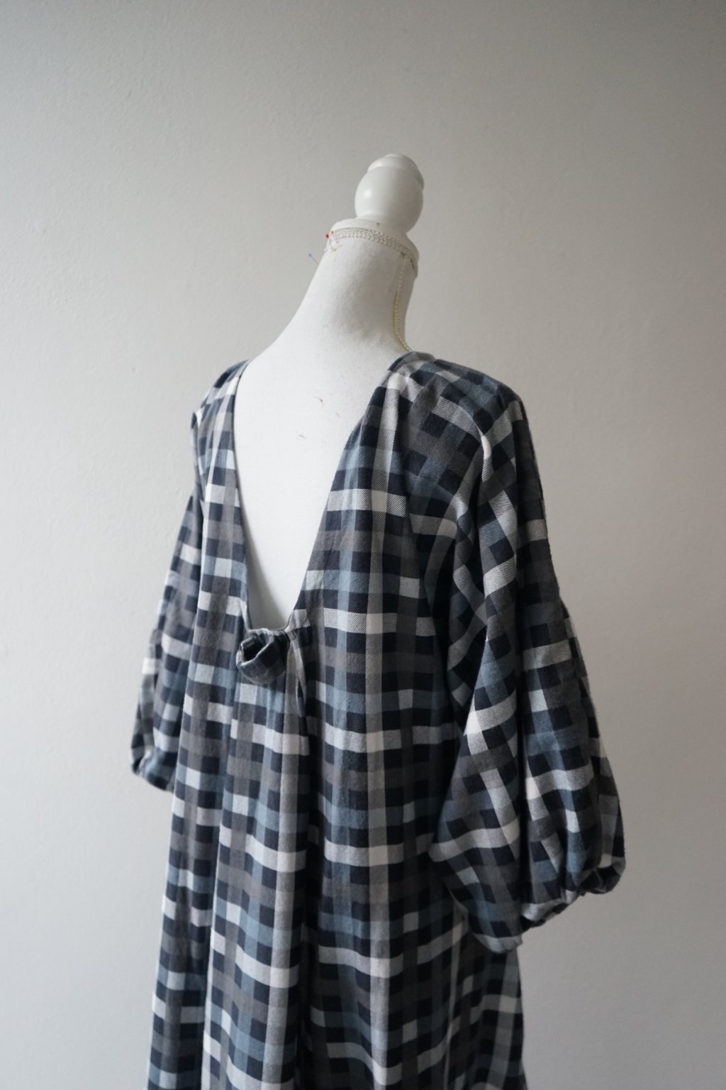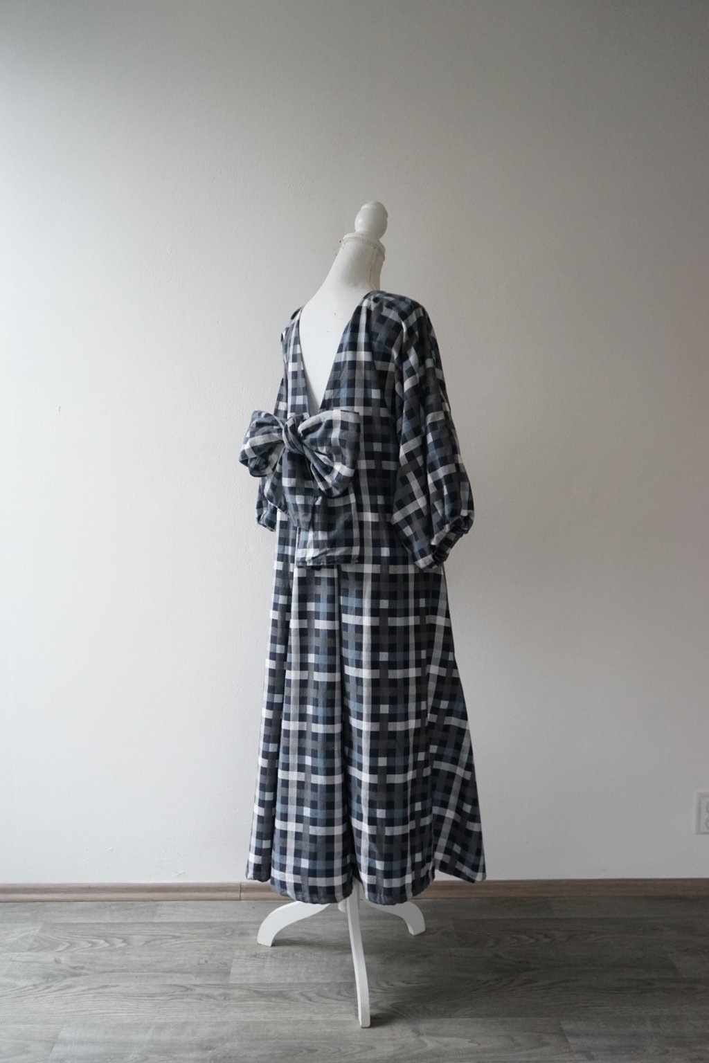 Šaty ušité s hřejivého bavlněného flanelu. Přesně před rokem jsem vydala finální podobu těchto šatů a měly u Vás velký úspěch. Tento konkrétní model byl však jejich předchůdcem. Plánovala jsem šaty volného střihu s mašlí na zádech – a to tyto mají. na zádech najdete všité očko, kterým protáhnete látku a mašli zavážete. Tento kus látky by při užším pasu (tak do 70cm) šel použít i jako pásek (proto na fotkách vidíte i přepásanou verzi, pásek však není dostatečně dlouhý, aby to tak fungovalo i u širšího obvodu). Tyto konkrétní šaty mají poměrně hluboký výstřih na zádech, ve finální verzi jsem výstřih měnila. Doporučuji tedy pro dámy, které si je dovolí nosit bez podprsenky. Tento sample mi opravdu posloužil a vyřídila jsem se na něm, snažila jsem se zde o áčkovou siluetu šatů díky záševkům ve vrchní části. Šaty tak jsou postupně do A bez jakéhokoliv horizontálního švu v oblasti pasu. Inu, výsledné šaty pro mě byly naprosto top, u těchto jsem měla problém právě s nemožností přepásání u větších velikostí (šlo by vyřešit jiným páskem:) a příliš hlubokým výstřihem. Věřím ale, že někomu nadělají plno parády!