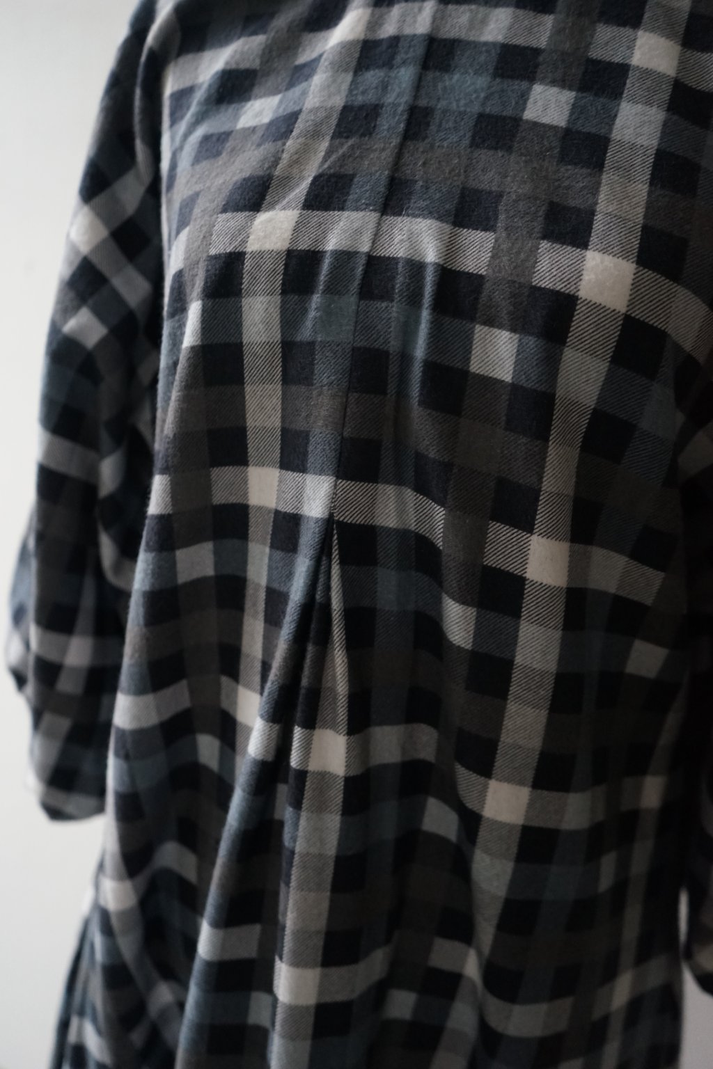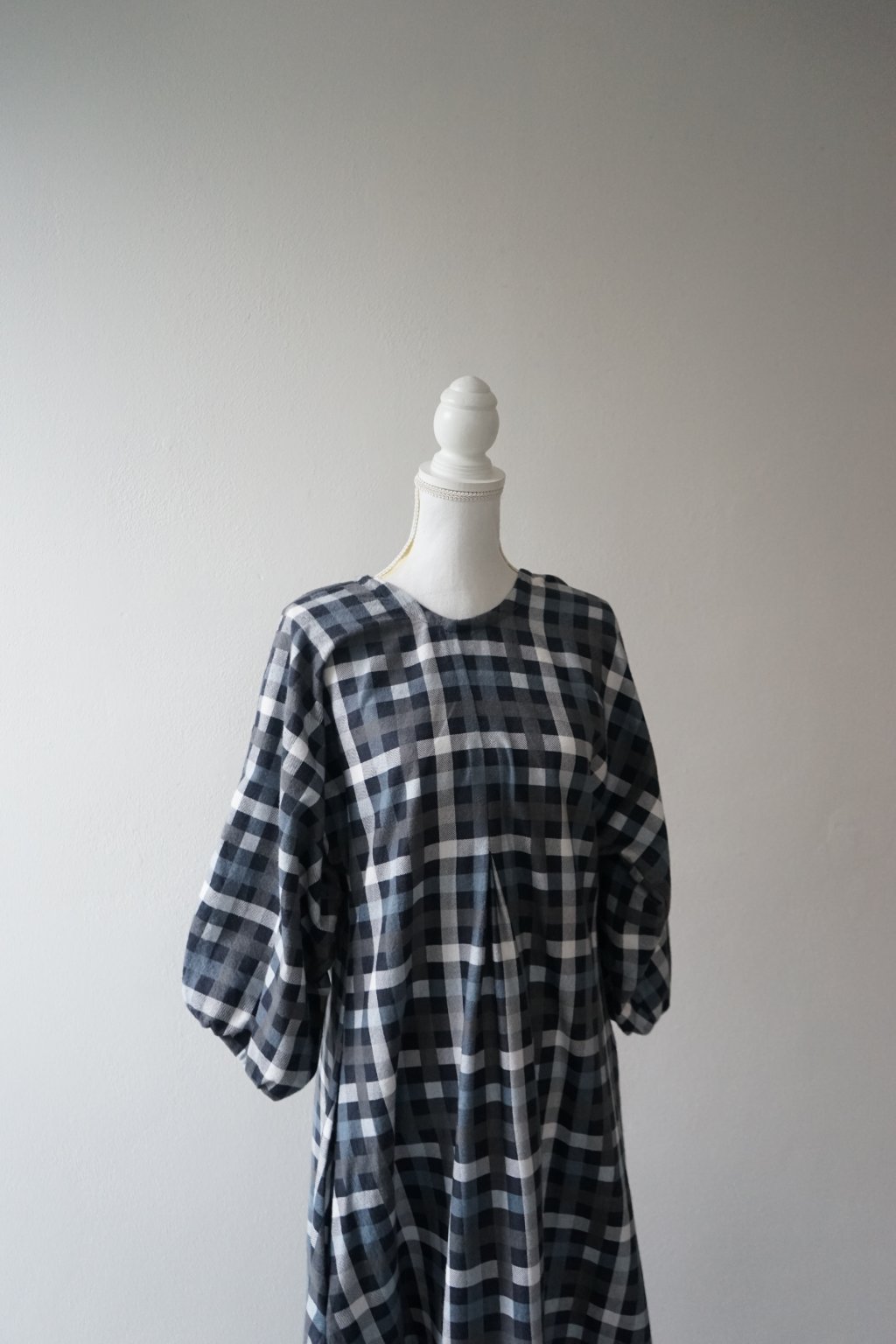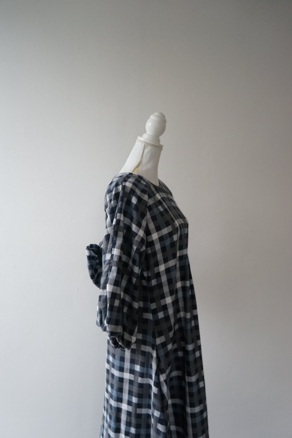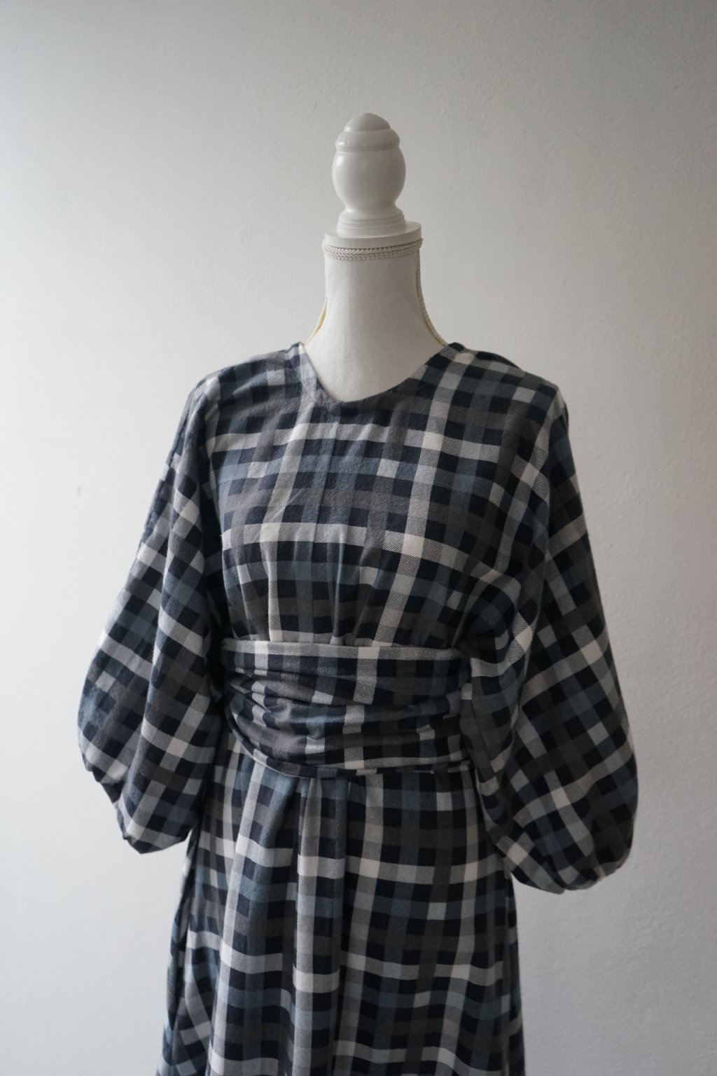 Šaty ušité s hřejivého bavlněného flanelu. Přesně před rokem jsem vydala finální podobu těchto šatů a měly u Vás velký úspěch. Tento konkrétní model byl však jejich předchůdcem. Plánovala jsem šaty volného střihu s mašlí na zádech – a to tyto mají. na zádech najdete všité očko, kterým protáhnete látku a mašli zavážete. Tento kus látky by při užším pasu (tak do 70cm) šel použít i jako pásek (proto na fotkách vidíte i přepásanou verzi, pásek však není dostatečně dlouhý, aby to tak fungovalo i u širšího obvodu). Tyto konkrétní šaty mají poměrně hluboký výstřih na zádech, ve finální verzi jsem výstřih měnila. Doporučuji tedy pro dámy, které si je dovolí nosit bez podprsenky. Tento sample mi opravdu posloužil a vyřídila jsem se na něm, snažila jsem se zde o áčkovou siluetu šatů díky záševkům ve vrchní části. Šaty tak jsou postupně do A bez jakéhokoliv horizontálního švu v oblasti pasu. Inu, výsledné šaty pro mě byly naprosto top, u těchto jsem měla problém právě s nemožností přepásání u větších velikostí (šlo by vyřešit jiným páskem:) a příliš hlubokým výstřihem. Věřím ale, že někomu nadělají plno parády!