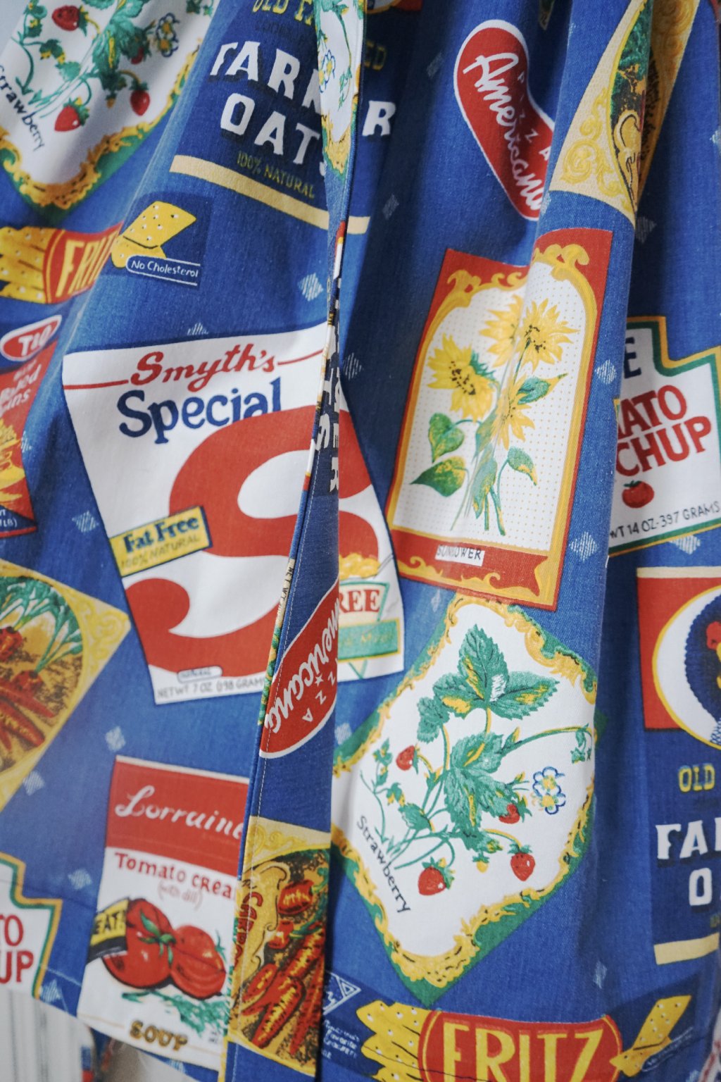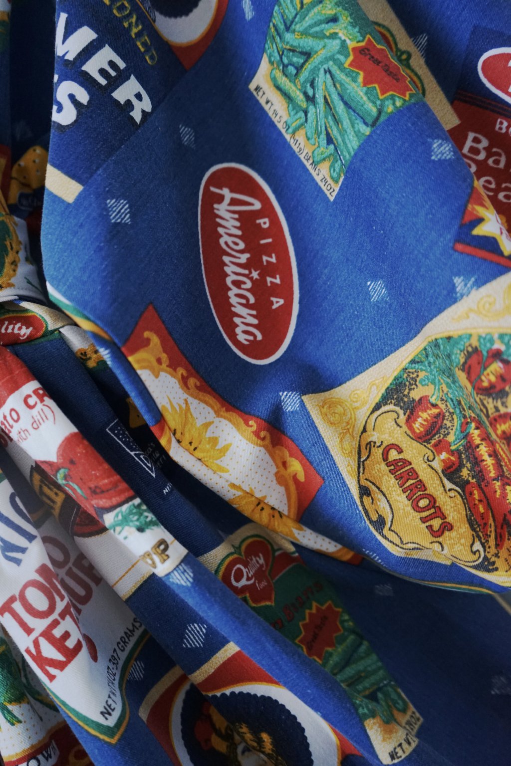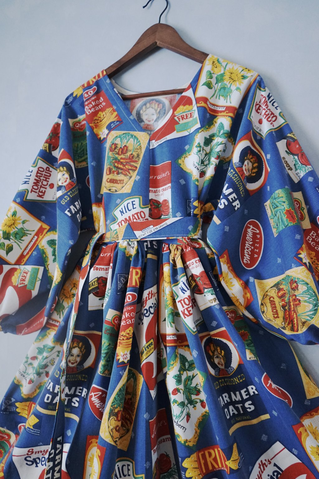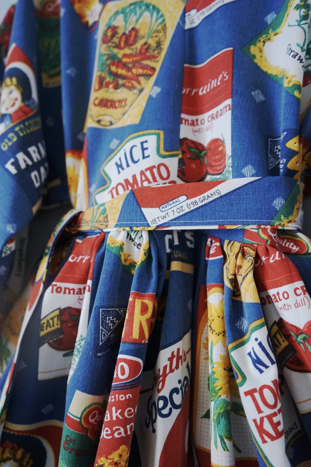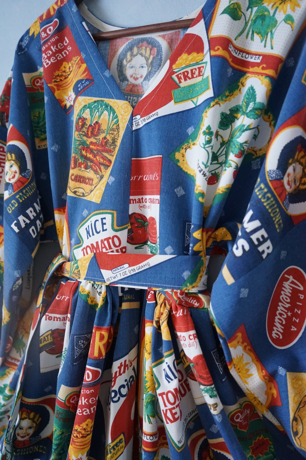 Tyto záclony z pevné bavlny s potiskem vintage amerických log je jedna z nejlepších věcí, co jsem ve finských sekáčích našla! A tak jsem pracovala tak, aby vznikly šaty s minimálním, ale opravdu téměř nulovým zbytkem látky, protože jsem ji všechny potřebovala využít! Opravdu bohatá řasená sukně skrývá kapsy a velké balónové rukávy tu byly samozřejmostí. Můžete je nosit s Včkem vepředu, i vzadu. Pásek je součástí šatů.