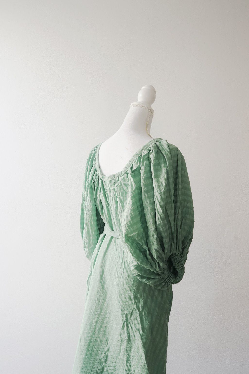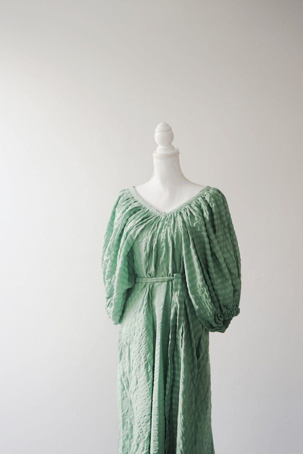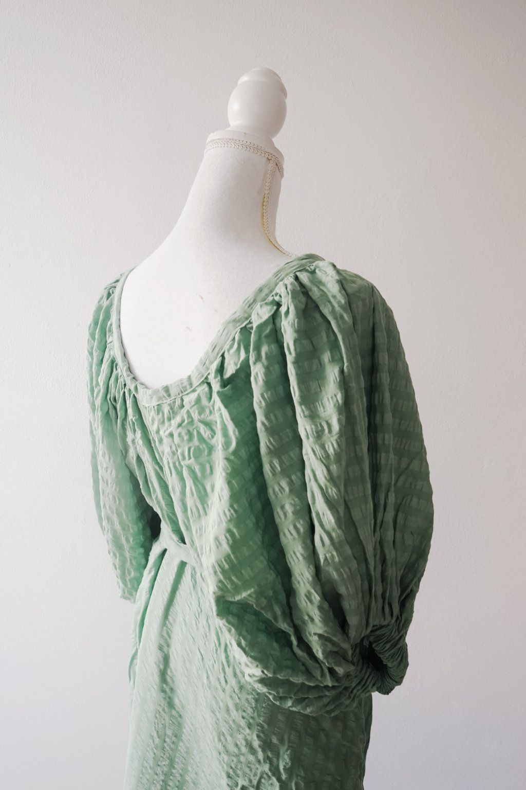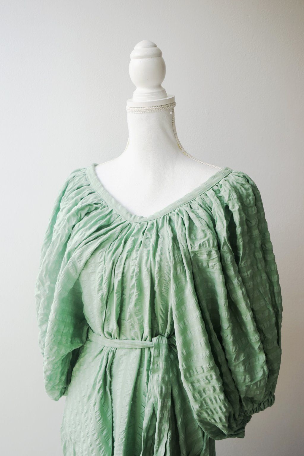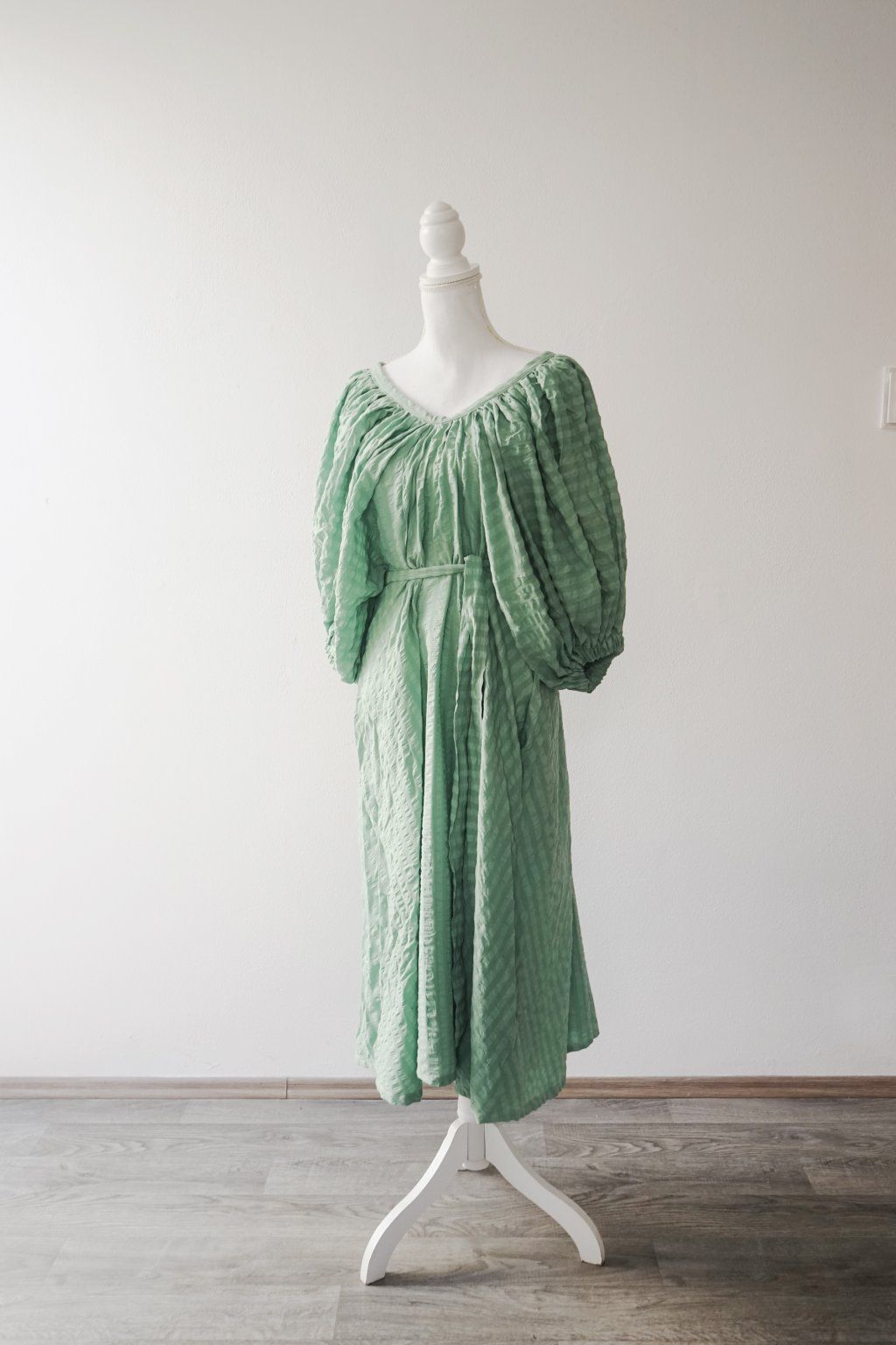Když vidím v secondhandu seersucker bavlnu, beru jí. Je to ten nejvíc super, vzdušný materiál s drobnou polštářkovou strukturou. Hezky se přizpůsobí tělu a zároveň umí při řasení dodat objem. A toho jsem přesně využila u tohoto střihu – rukávy jsou řasené jak od výstřihu, tak v gumičkách. Áčková sukně je pak umírněná a tak všechno to drama přenechává rukávům. Páskem si je vypasujete dle potřeby.
