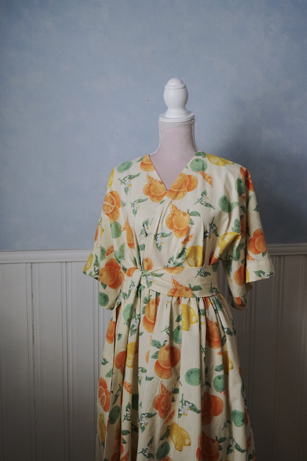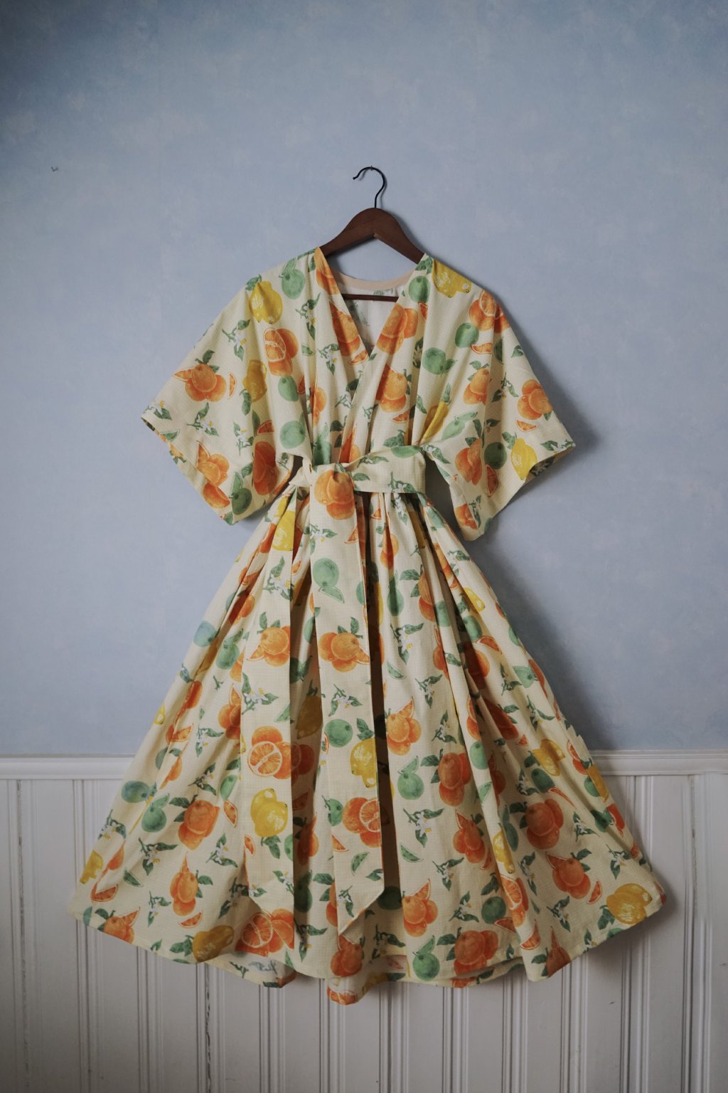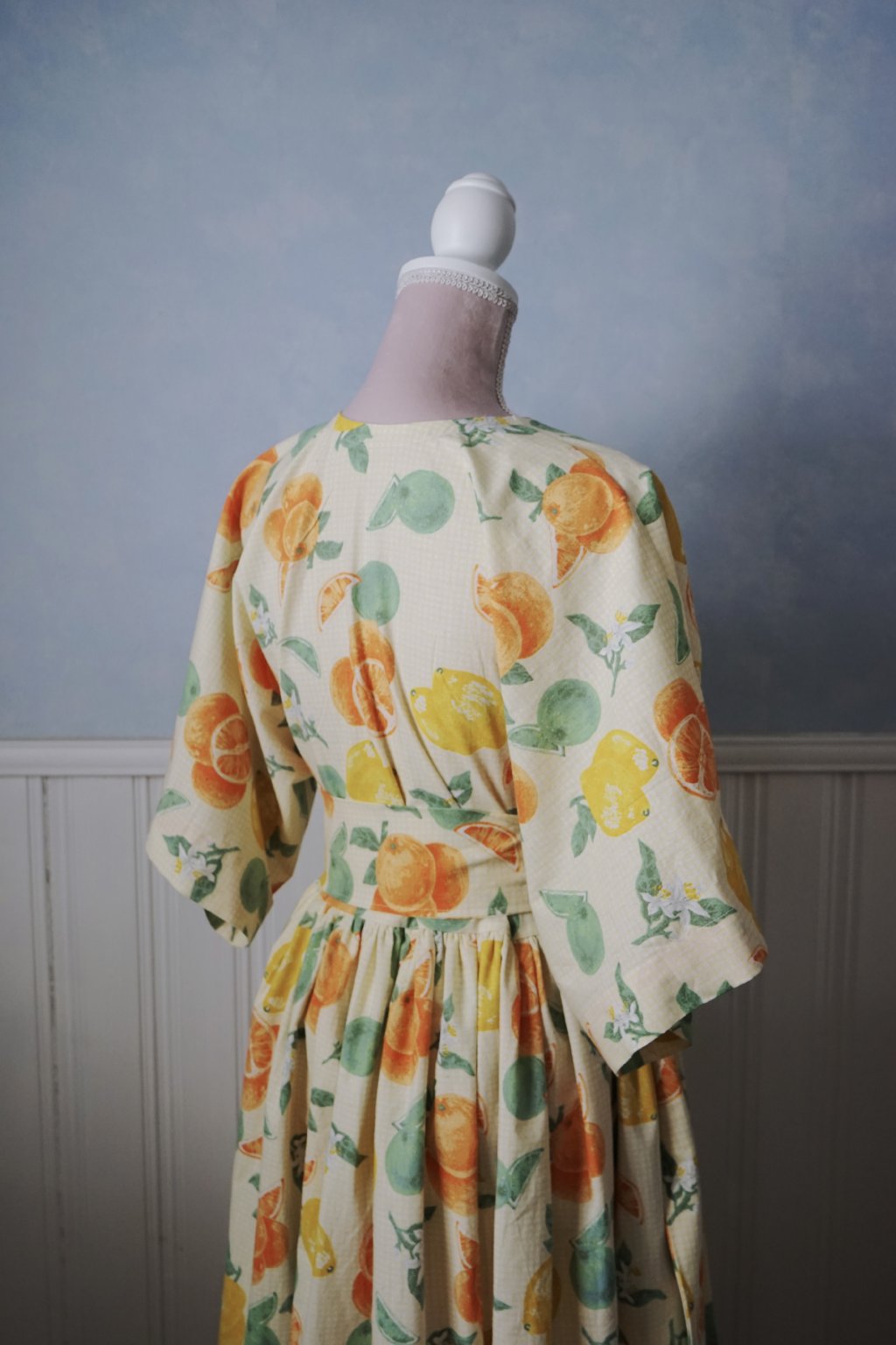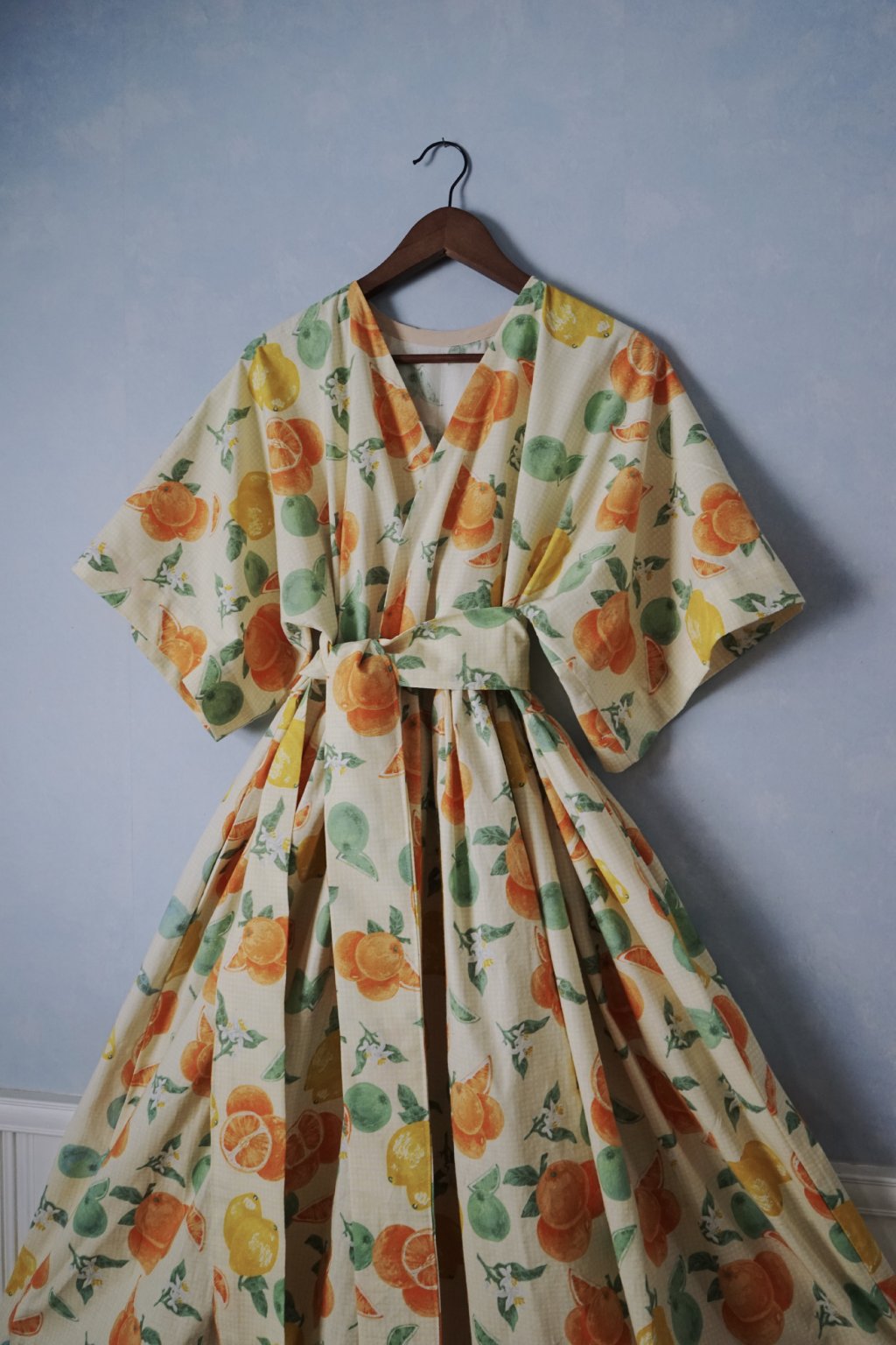Látku s citrony jsem hledala poslední dva roky od té doby, co jsem pila v Itošce limoncello. Neúspěšně až doteď. :D Tyto bavlněné závěsy bych si dokázala představit v nějakém super boho interiéru, nicméně radši je nakonec vidím jako šaty! Bohaté, se skladným výstřihem, který se neotevírá. (nicméně tento střih je třeba super i na kojení!). Kimono rukávy, skryté kapsy, pásek. Mají vše. Vzor citronků a pomerančů je navíc krásně posazen do velmi drobné béžové/bílé kostky!