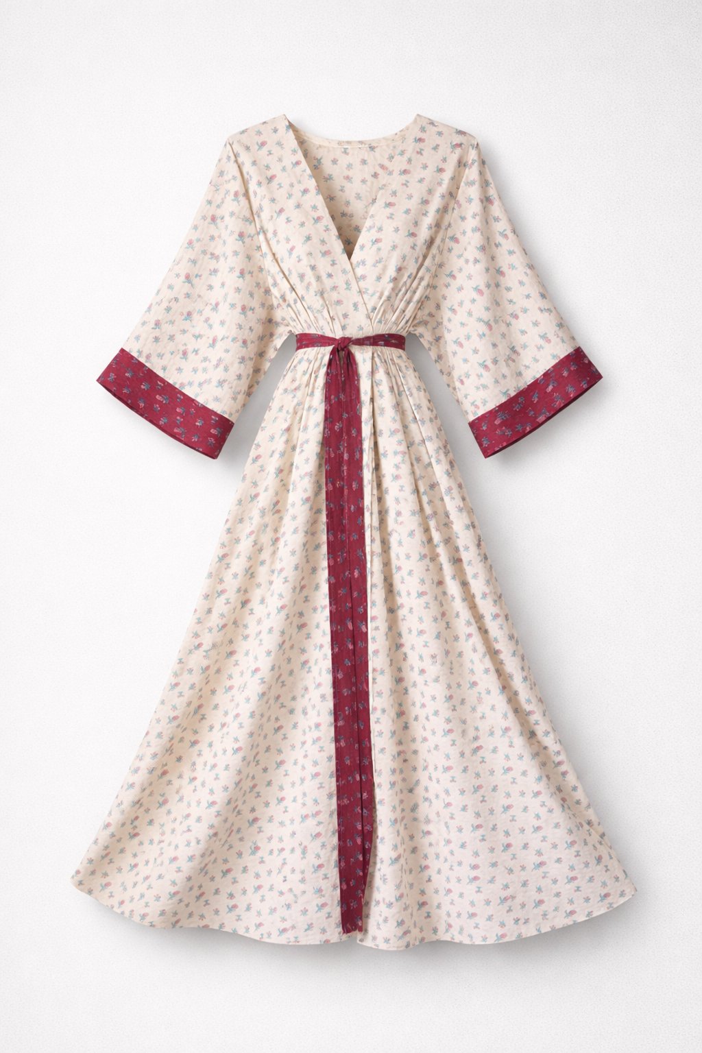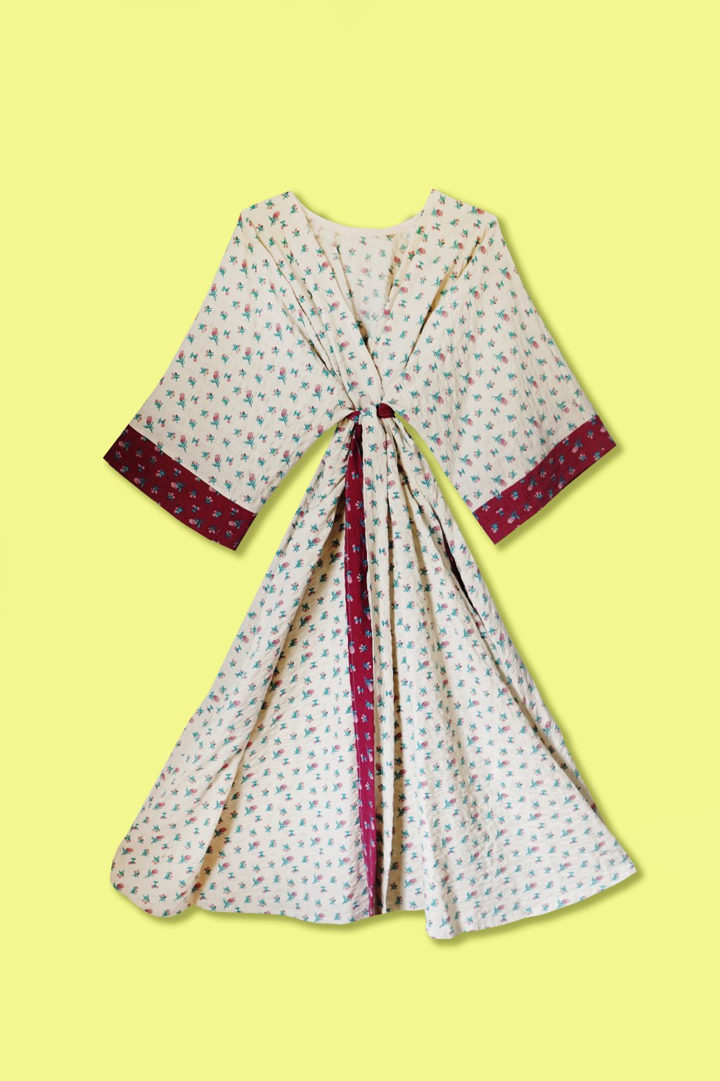 Šaty upcyklované ze dvou látek se stejným vzorem – jde o bavlněný seersucker, látku, která je typická pro svoji polštářovou strukturu, nadýchanost, měkkost. Tyto celoroční šaty budou dýchat, dlouhý kimono rukáv je opepřen právě druhou, kontrastní látkou v lemu a stejně tak i vnitřek kapes, které najdete v sukni. Na těchto šatech mě nejvíc baví pásek, který taktéž kombinuje obě barvy látek a vytváří tak při uvázání na šatech lehce asymetrický efekt.